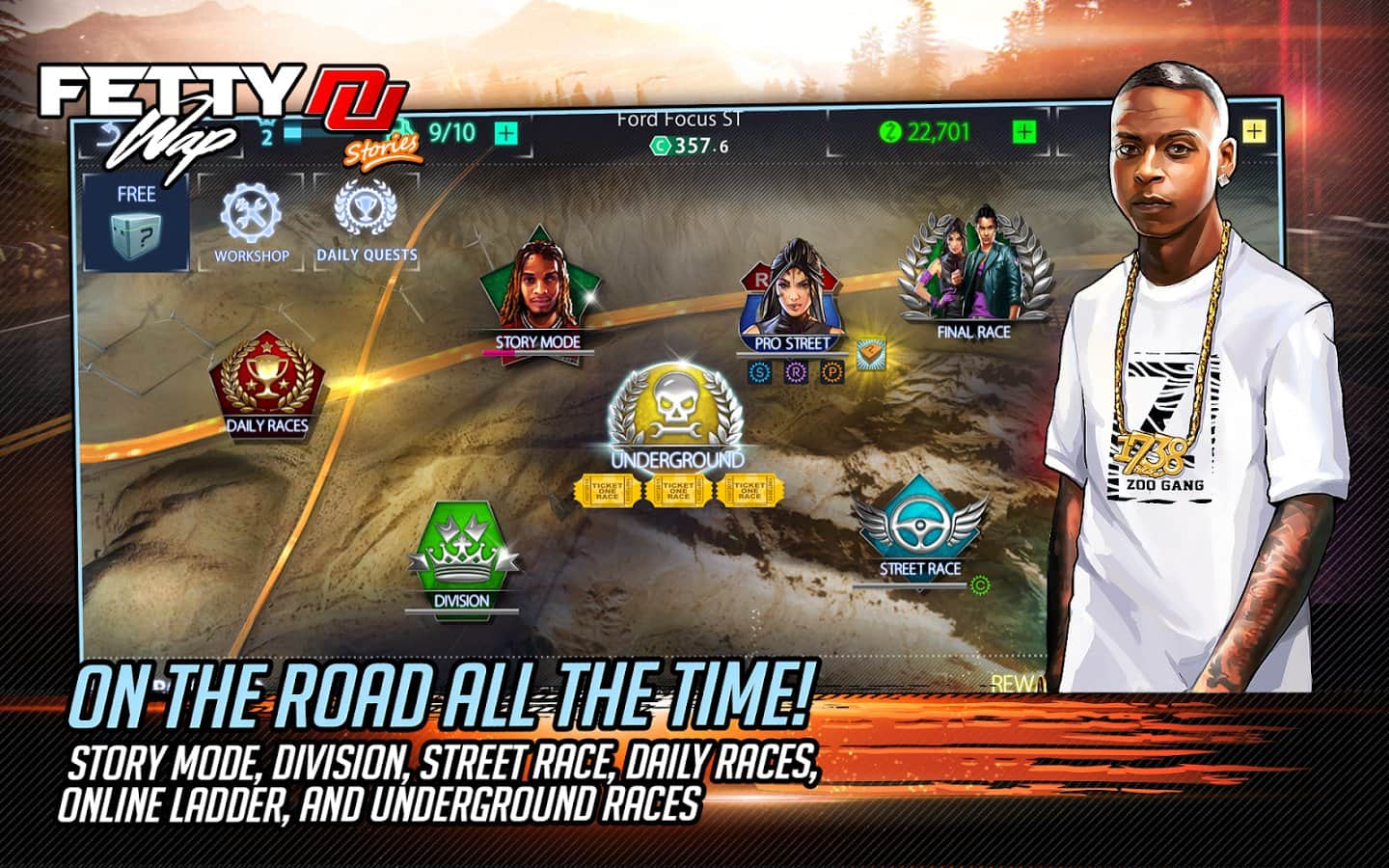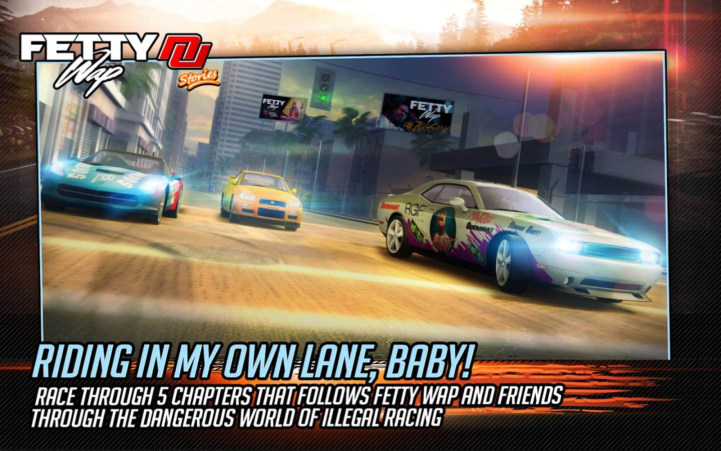 Fetty Wap Nitro Nation Stories - carrera de arcade de Creative Mobile, que ha lanzado en su historia, mucho más de un éxito en esta dirección. En esta ocasión, los desarrolladores decidieron no solo añadir una historia completa, sino construirla alrededor del popular artista occidental Fetty Wap. La trama se desarrolla en torno a un rapero popular y su equipo, que participa en carreras callejeras. De acuerdo con los clásicos del género y el entorno de carreras, tienes una enorme selección de coches de lujo, Alfa Romeo, BMW, Cadillac, Chevrolet, Chrysler, Dodge, Ford, Honda, Infiniti, Jaguar, Mazda, Nissan, VW y SSC, esta no es una lista completa de ellos. Fetty Wap Nitro Nation Stories ofrece la oportunidad de participar en varios modos de juego como "Historia", "División", "Carreras callejeras", "Carreras diarias", "calificación de potencia" y "carreras subterráneas", así que todos pueden encontrar algo interesante para sí mismos. Excelentes gráficos y una banda sonora bien elegida en el estilo de la atmósfera general del juego simplemente completan el cuadro general.