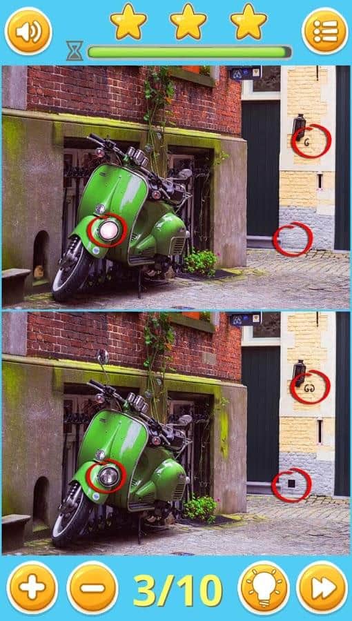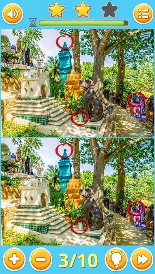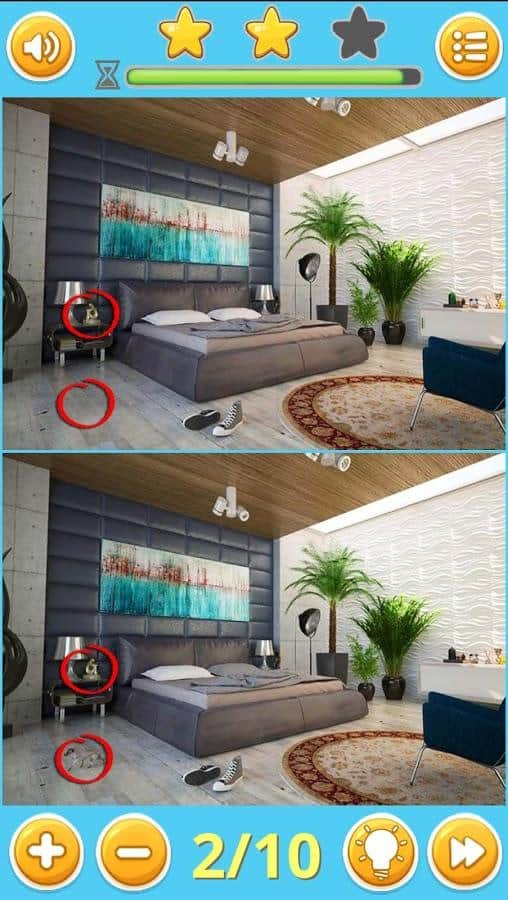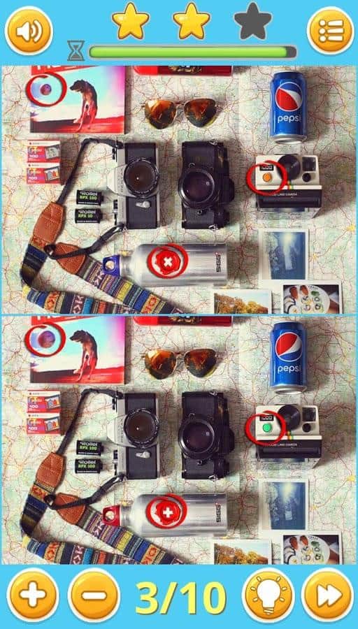 Encuentra las Diferencias: Juego de Rompecabezas – el juego clásico "spot the difference". En este juego podrás ver en la pantalla imágenes que parecerán iguales a simple vista donde buscarás las 10 diferencias. Juega a este juego y mejora tu atención, memoria e inteligencia. Este juego es perfecto tanto para niños como para adultos. Todas las imágenes están clasificadas en diferentes categorías, que en el juego son un gran número, tales como: animales, arte, coches, comida, vacaciones, interiores, objetos, personas, vintage y viajes. En total en el juego encontrarás 250 niveles, excelente calidad de imagen y la capacidad de ampliarlas.