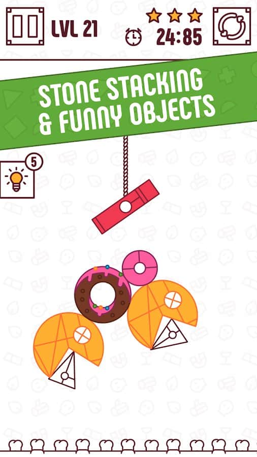 Encuentra el equilibrio - Puzzle divertido de objetos físicos - emocionante juego de rompecabezas para Android donde construyes una torre de diferentes objetos. Varios objetos están atados a una cuerda y caen, tu tarea será instalarlos, cortando la cuerda para que construyan una torre y mantengan el equilibrio. Coloca los objetos en diferentes secuencias y mantén el equilibrio, sin dejarlos caer incontrolablemente. Entrena tu excelente respuesta e inteligencia completando 100 niveles del juego. El juego cuenta con 4 modos: clásico, estrellas, infinito y Navidad. Desbloquea los 10 objetos para cortar y disfruta de la física realista.