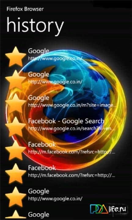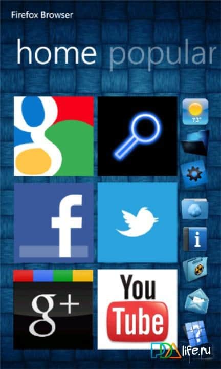 ¡Presentamos a su atención un Firefox en Windows Phone 7! El navegador web más conveniente y rápido ahora está disponible para su dispositivo. Con él, puede guardar fácilmente el historial de páginas visitadas, marcar sitios y utilizar diferentes fondos personalizados. ¡Descargue gratis el navegador web en el enlace a continuación!