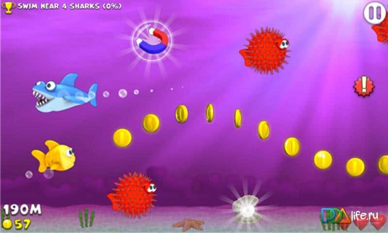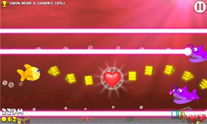 Fishy Rush - un juego emocionante para Windows Phone que te sumergirá en el mundo submarino de los habitantes del mar. Ayuda a un pequeño pez amarillo que se ha perdido a regresar a casa sano y salvo. Embárcate en una emocionante aventura, donde te espera un enorme mundo submarino con diversos habitantes, como un enorme tiburón blanco, peligrosas mantarrayas eléctricas y erizos afilados. Supera todos los obstáculos y recoge monedas de oro y bonificaciones, así como participa en diversas misiones que te brindarán mejoras adicionales.