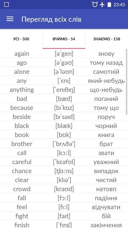 Quinientos palabras en inglés - Aplicación única para aprender inglés. La aplicación es muy simple, al principio tienes que navegar por las 500 palabras. De ellas, elegirás cuáles conoces y cuáles estás estudiando. Al elegir todas las palabras, irás directamente al estudio.