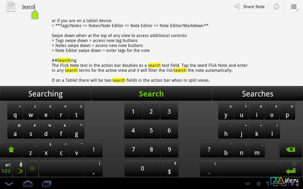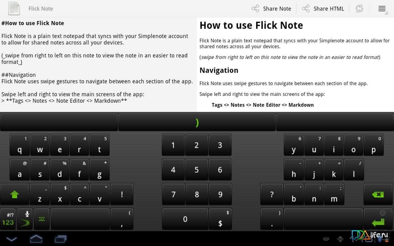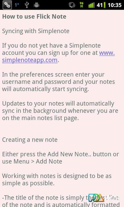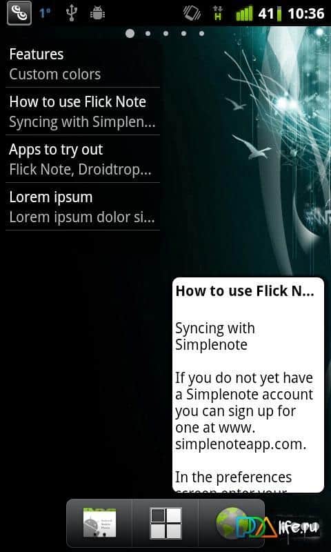 Flick Note – un programa simple y rápido en Android del desarrollador Teragadgets para crear notas, almacenamiento offline y online, soporte para etiquetas, resaltado de números y direcciones de correo electrónico, sincronización con el recurso simplenote y mucho más. ¡Utilízalo!