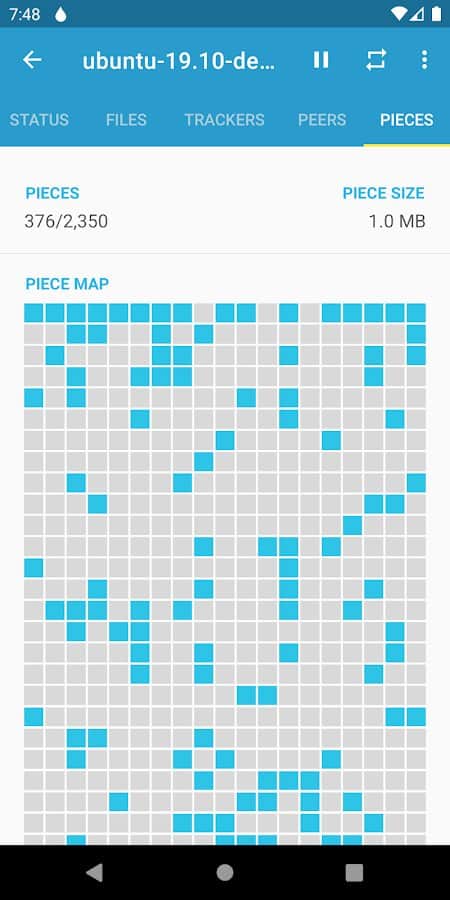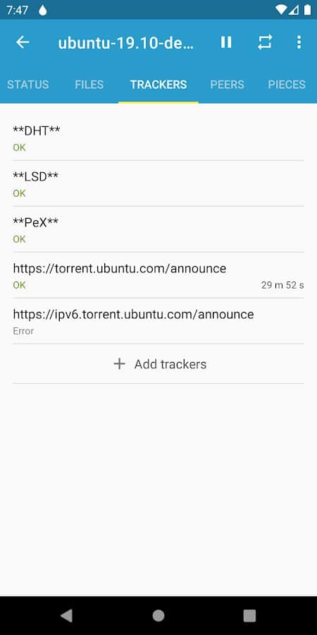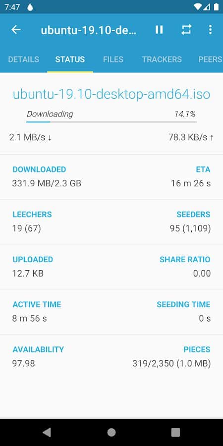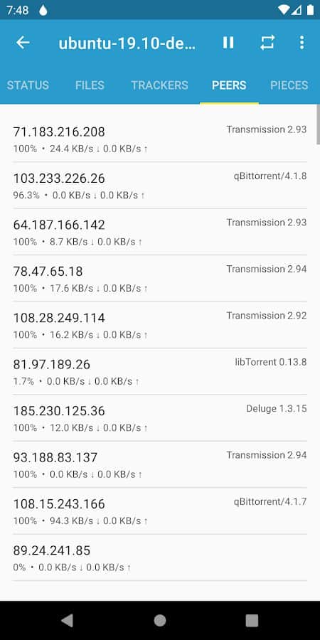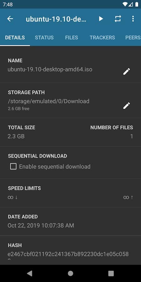 Flud - Cliente de Torrent - ¡Mira el estado exacto de los archivos que descargaste ahora mismo! Selecciona ciertos archivos para descargarlos en tu propio teléfono inteligente, espera a que se carguen en la aplicación, determina dónde quieres transferirlos y luego distribúyelos a otros teléfonos. Cuando termines de trabajar con los archivos, puedes moverlos a otro directorio o ponerlos en un disco externo para su uso posterior. Además, siempre puedes cambiar la apariencia de la aplicación usando temas: claro, oscuro o claro con una barra de herramientas oscura.