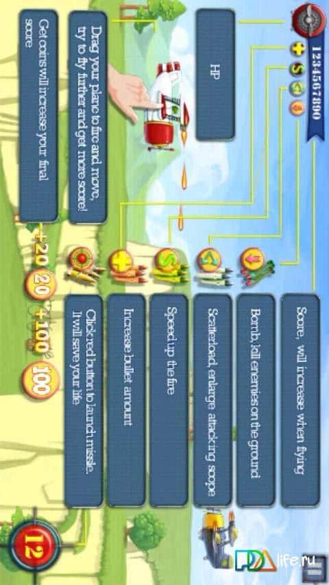 Fly Boy - un juego en Android en el que necesitas defender tu avión del fuego enemigo. Vuela sobre el suelo y dispara a los enemigos con tu arma y utiliza las 6 mejoras diversas: incluyendo bombas, balas aceleradoras, aumento de la región de fuego y aumento en el número de balas. Recoge bonificaciones y mejora tu avión, comprando todo tipo de mejoras.
