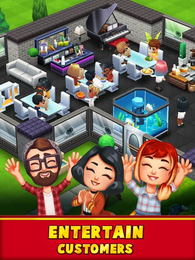 Simulador de restaurante con gráficos tridimensionales coloridos.