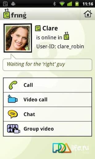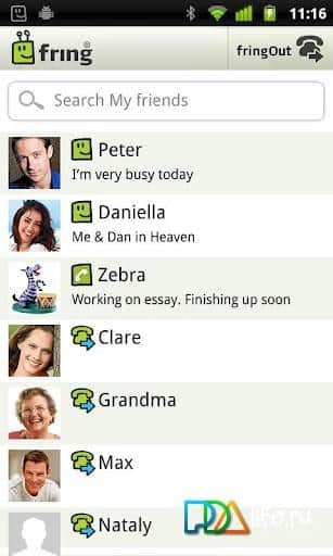 tienda es un gran cliente móvil para android, soporta ICQ (chat) Skype (llamadas), Twitter (chat), SIP (llamadas telefónicas), AIM (chat), MSN Messenger, Google Talk, Yahoo (chat). Una de las primeras aplicaciones que soporta cámara frontal. Los desarrolladores han actualizado el mensajero, así que ahora tiene soporte para videollamadas, incluyendo el uso de la cámara frontal. El programa es muy popular y está ganando fanáticos a un ritmo frenético. Lo que me gustaría destacar es la necesidad de registrarse en fring.com (se admite el idioma ruso), toma los contactos de la libreta de direcciones en el teléfono.