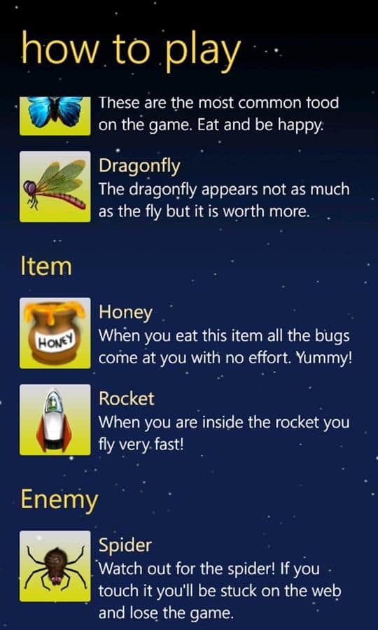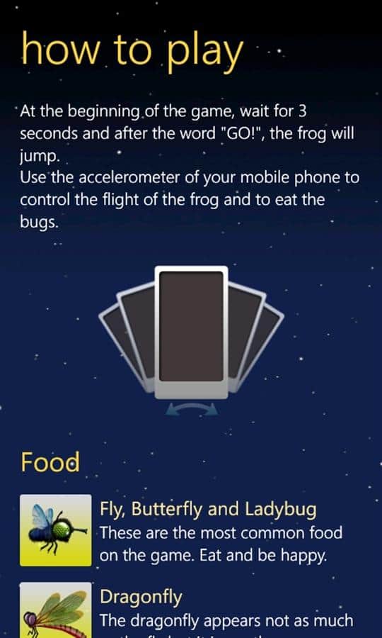 Rana es un alegre juego de arcade para Windows Phone sobre una pequeña rana hambrienta. Tienes que ayudar a alimentar a los animales. Usando el acelerómetro, controlas lo que sucede a tu alrededor. Pero para alimentar a tu amigo verde, primero debes atraer a los bichos, y esto es muy adecuado para la miel, ya que todos los bichos e insectos que vuelan hacia él vienen en manadas. Solo tienes que lograr atrapar la comida con la lengua y tragarla.