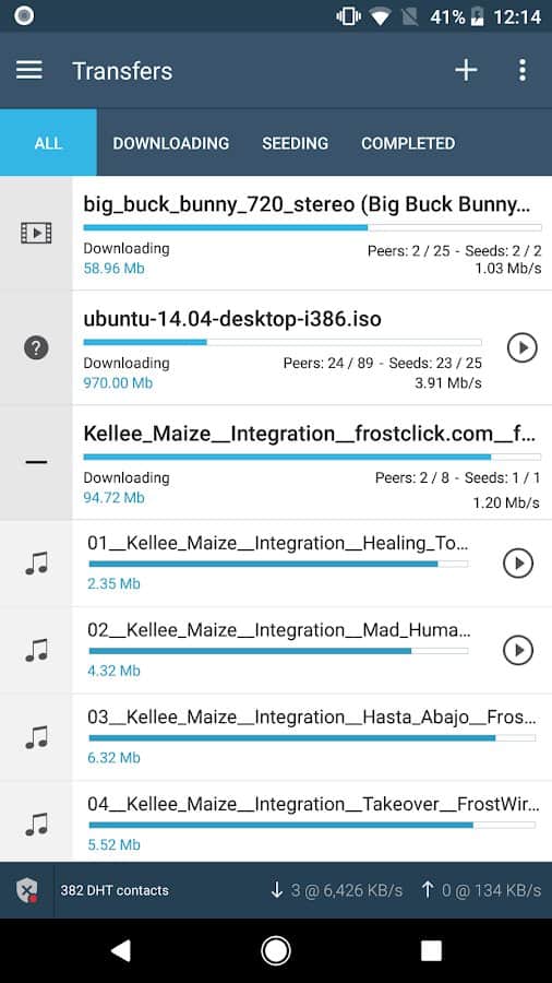 FrostWire Descargador y Reproductor - A su disposición tendrá una búsqueda de archivos torrent, descarga de cualquier formato de datos, música, visualización de información descargada, soporte técnico, configuraciones y más. Dentro de la aplicación, los registros no se dividen en varias categorías, por lo que no tiene que distribuir carpetas por formatos usted mismo. Reproduzca mientras descarga, reproduzca automáticamente los archivos necesarios, renombre y elimine datos de la aplicación, y comparta las carpetas terminadas con otras personas.