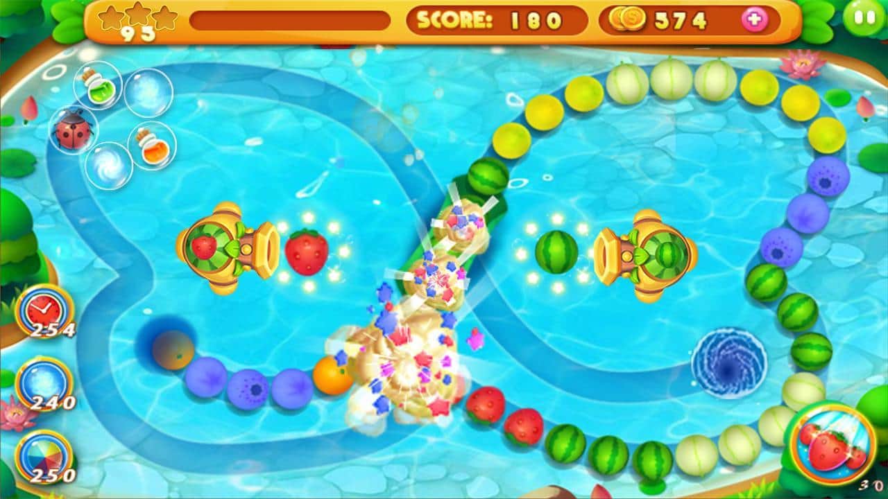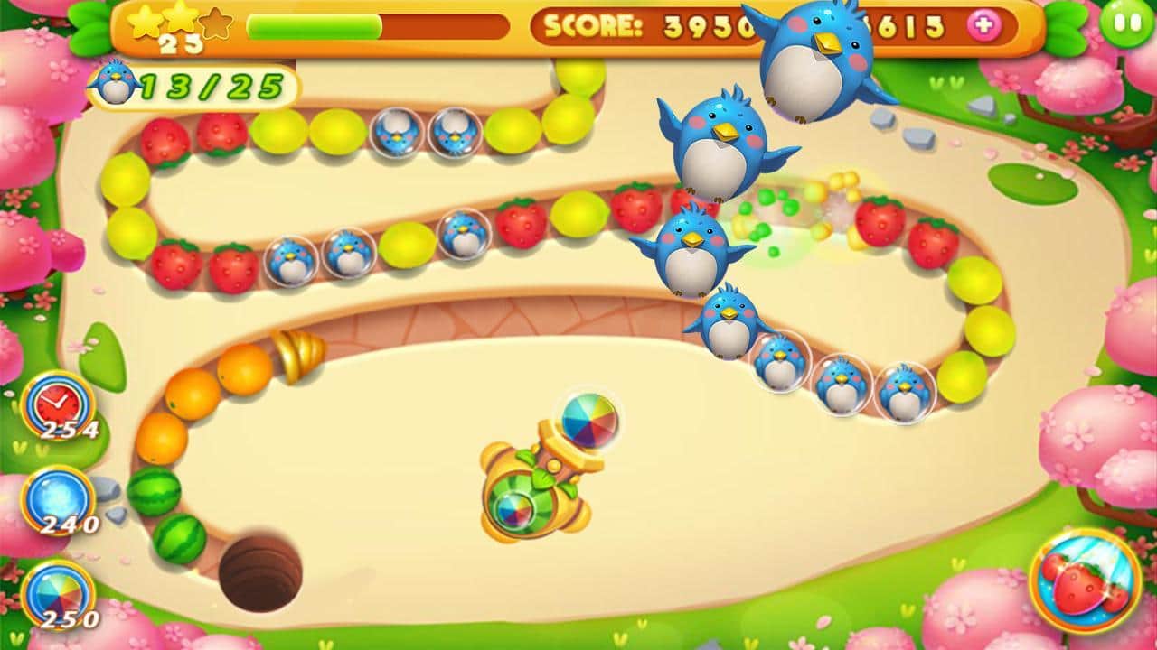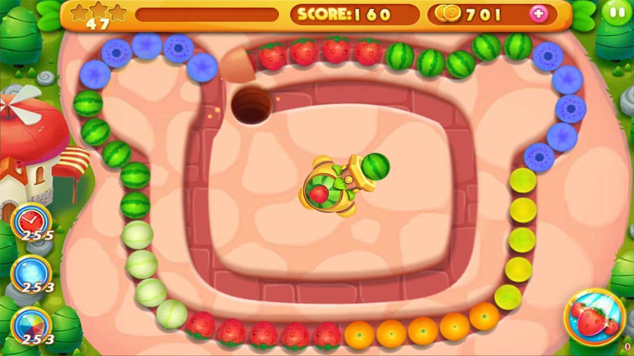 Fruit Marble – empareja filas de frutas jugosas el mayor tiempo posible y elimínalas del campo. En este juego te encontrarás en un mundo de cuento de hadas compuesto de frutas y bayas, donde tu tarea es disparar desde un cañón con frutas de colores en la cadena en movimiento. Haz una cadena lo más larga posible y hazla explotar, guiando el movimiento de las frutas hacia el agujero negro. Usa toda tu ingenio y buena reacción para no permitir que las frutas lleguen a la salida, de lo contrario el juego terminará y el nivel se reiniciará. Ante ti hay 108 niveles divertidos, 6 mundos únicos y diferentes misiones que llaman a las frutas.