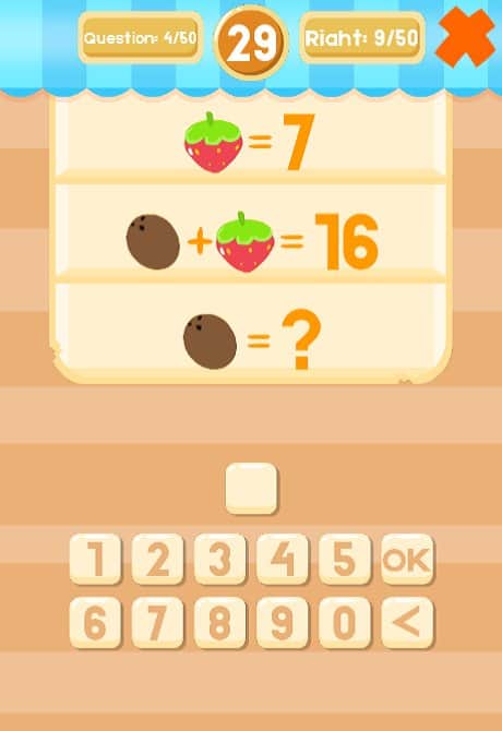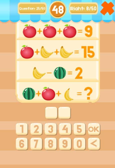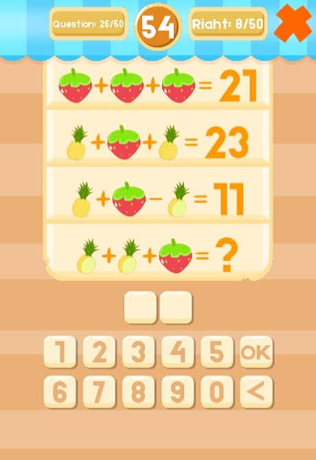 Fruit Math es un juego de rompecabezas interesante y entretenido para Android donde resolverás acertijos desafiantes. En este juego se te mostrarán diferentes ejemplos de frutas, tu tarea será resolverlos en tu mente y escribir la respuesta correcta. Este juego es adecuado tanto para adultos como para niños, donde pueden aprender rápidamente a contar y resolver ejemplos. El juego te complacerá con unos gráficos coloridos fantásticos, y numerosos ejemplos y problemas, y una jugabilidad adictiva, donde tendrás que romperte la cabeza para pasar un nivel determinado. Con cada nuevo nivel, la complejidad del juego aumentará.