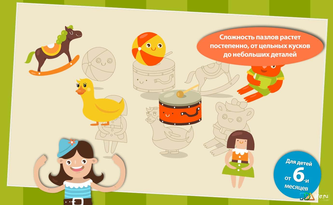 "Rompecabezas para niños - juego educativo infantil para Android. El juego es perfecto para los niños, es un rompecabezas brillante y colorido que pueden resolver incluso los niños desde los 6 meses. De rompecabezas a rompecabezas, el nivel de dificultad aumenta. El juego desarrolla en los niños: