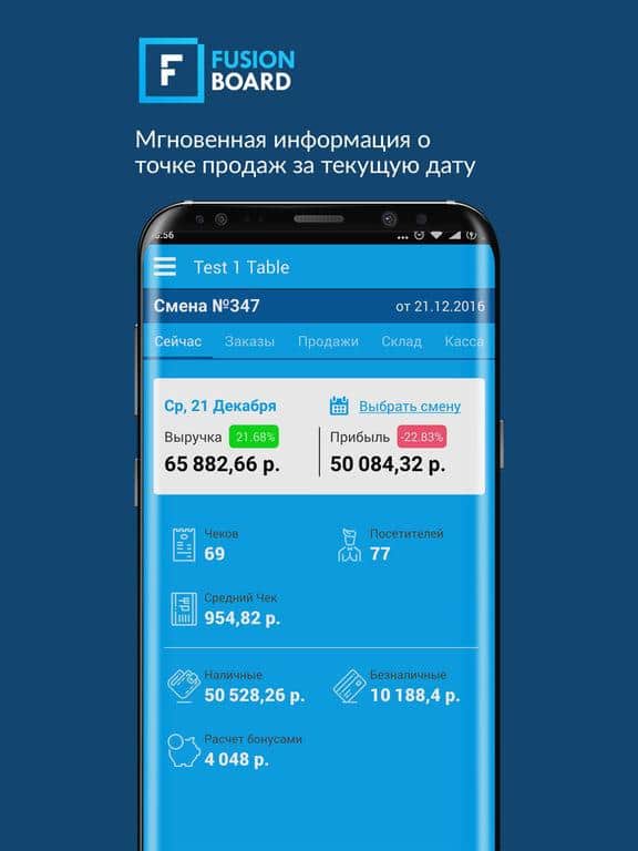 Fusion Board está destinado a empresarios, propietarios de cafeterías, bares, restaurantes, cafés o tiendas. Si estás entre ellos y utilizas el sistema de automatización Fusion POS, asegúrate de instalar esta aplicación. Te permitirá monitorear el estado de tu establecimiento desde cualquier punto del globo. Podrás conocer las últimas noticias sobre el número de visitantes en tu institución, los saldos de productos en stock, sobre pedidos, sobre cuánto dinero se recaudó en el día y otra información necesaria.