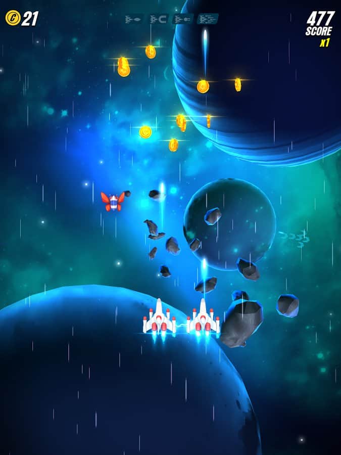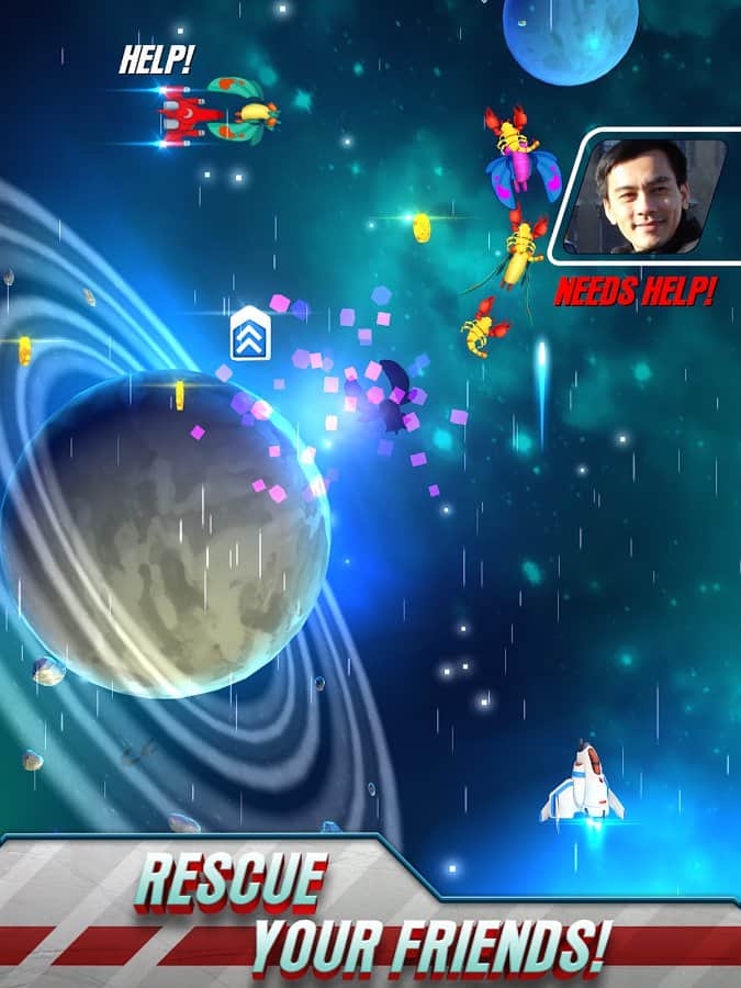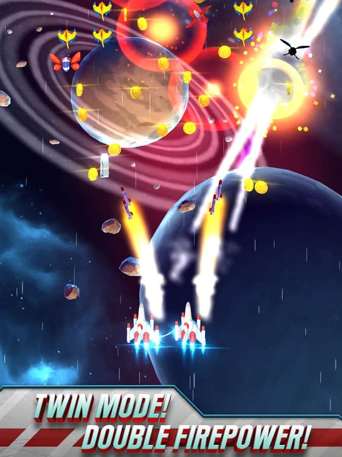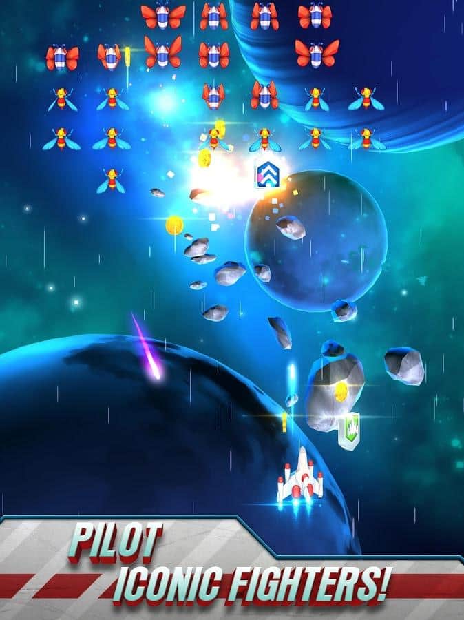 Galaga Wars – un juego en Android donde tu tarea es salvar la galaxia de la destrucción por parte de los alienígenas. Eres el único que se ha ofrecido para enfrentarse solo al ejército de naves enemigas. Ponte al volante de tu nave y dispara continuamente a los enemigos. Usa toda tu destreza y excelente respuesta para repeler una gran cantidad de naves. Lucha a través de interminables oleadas de enemigos que tienen especies únicas de abejas, mariposas, escorpiones y otros insectos. Al final de cada nivel te enfrentarás a los poderosos jefes. Invoca la ayuda de tus amigos y juega con ellos en modo dual, destruyendo tantos enemigos como sea posible. Las cuatro naves espaciales, y cada una de ellas tiene armas únicas: láser, disparos explosivos, minas cómicas y el escudo del espíritu.