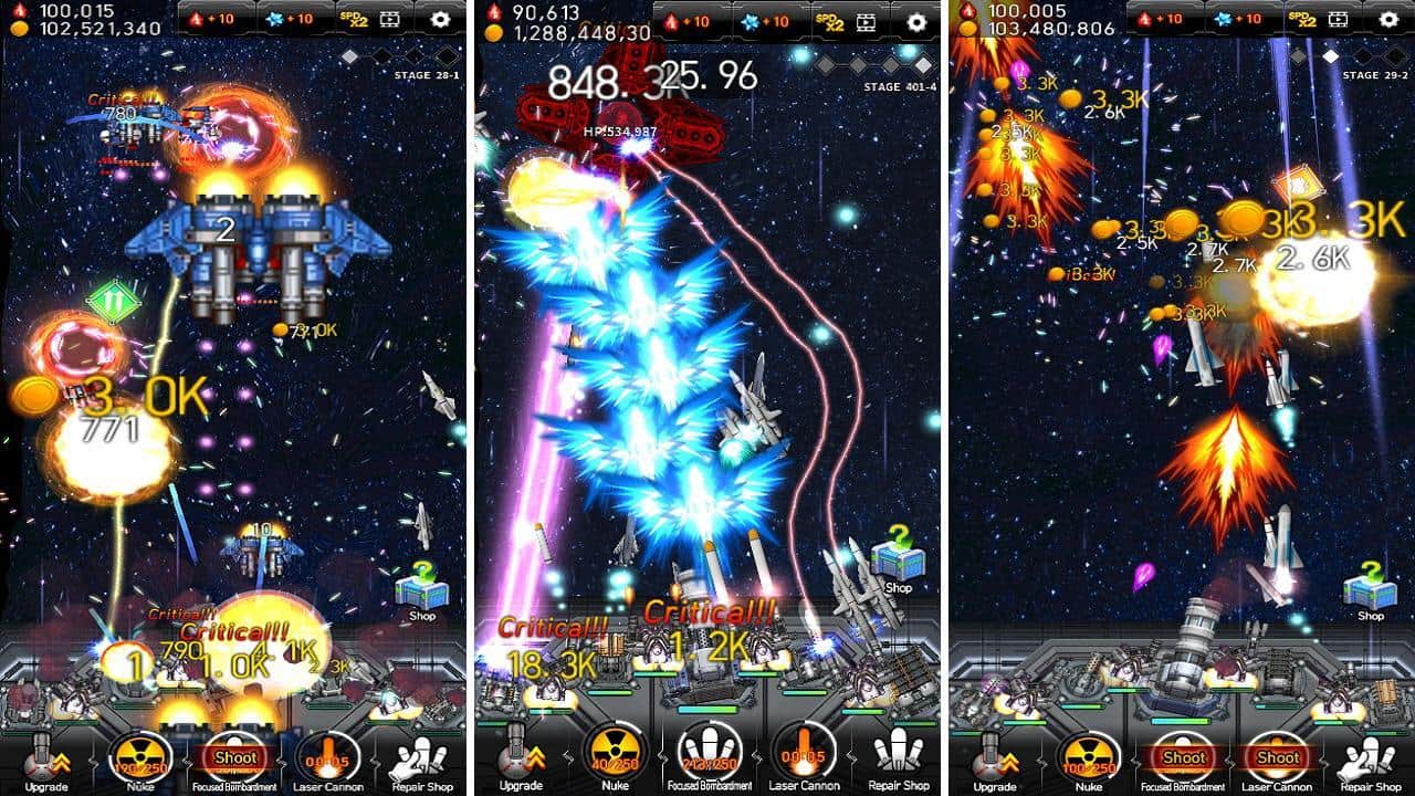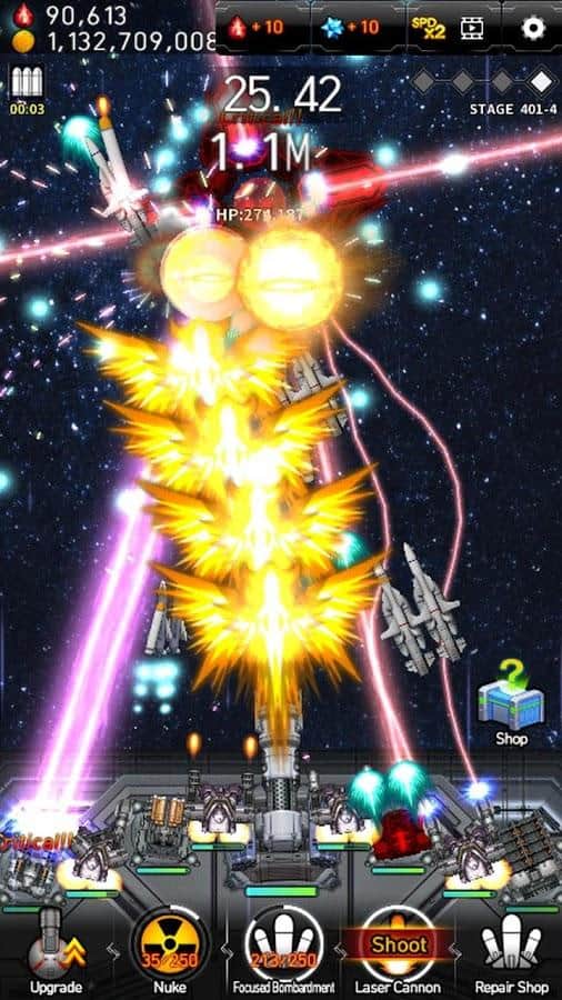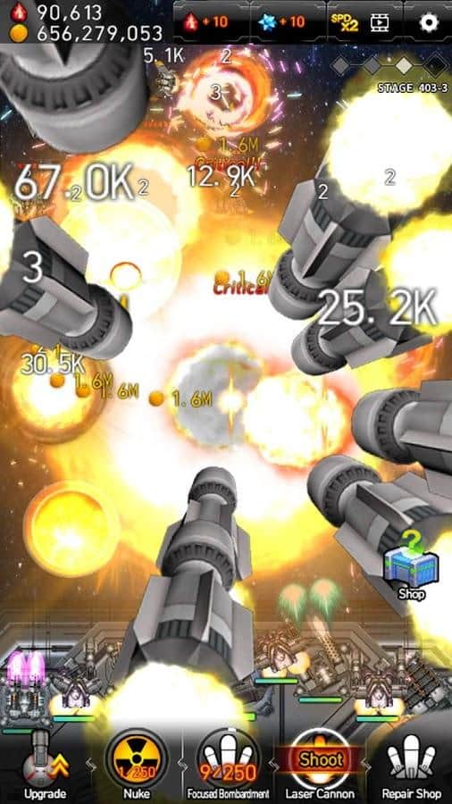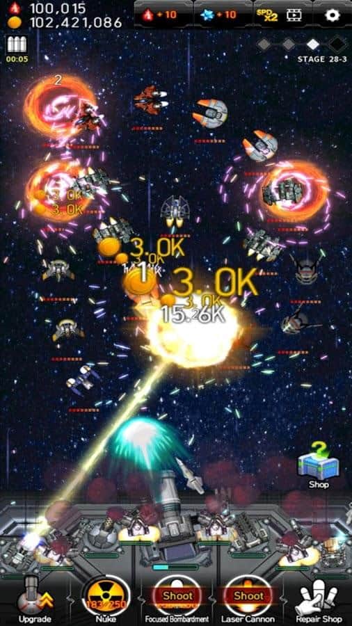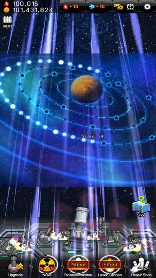 Guerra de Misiles Galáctica - un fascinante clicker en Android. En este juego te encontrarás al mando de la nave espacial. Tu objetivo es destruir las naves y misiles enemigos. En la Guerra Galáctica, las mejoras estratégicas de misiles son de gran importancia en el campo de batalla. Encontrarás más de 100 nuevas unidades y armas, más de 100 personajes enemigos y 32 cañones astronómicos y mejoras ilimitadas. Y la cinofobia y los gráficos dinámicos visuales del juego complacerán la vista