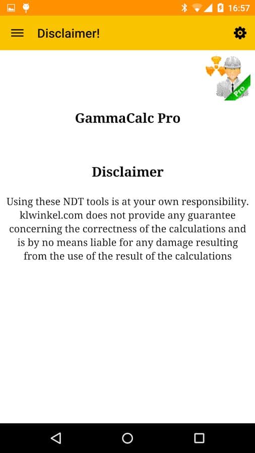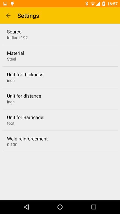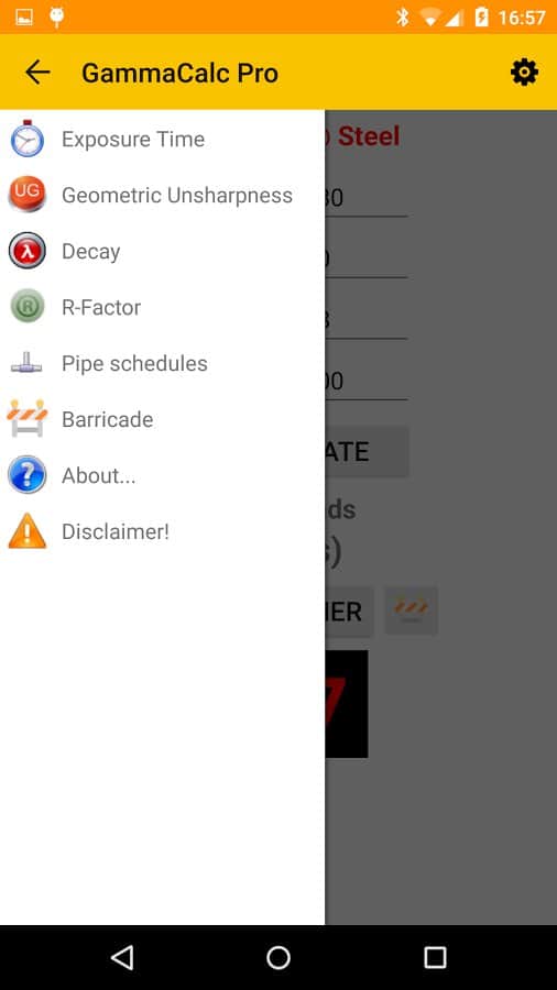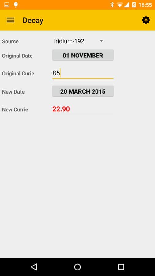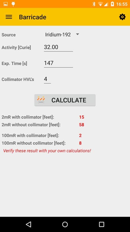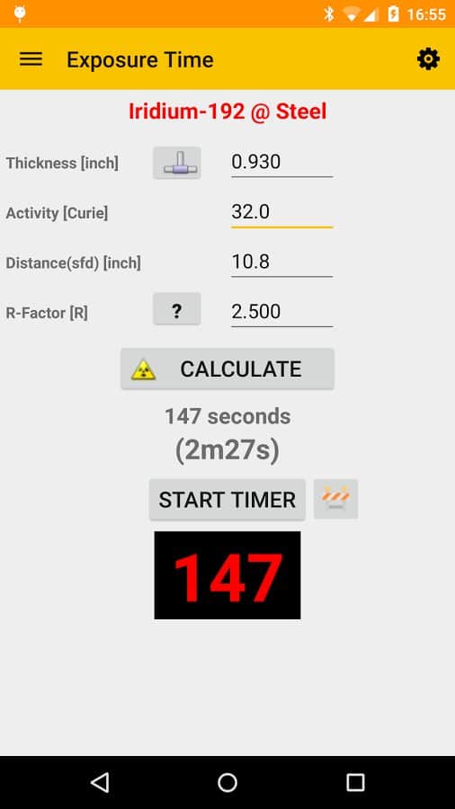 Calculadora de Rayos Gamma Pro - con esta aplicación, los técnicos pueden calcular con precisión el tiempo, la distancia y la exposición para dispositivos con rayos X. El programa permite un control total sobre las fuentes con iridio-192, cobalto-60 y selenio-75. En el cálculo de fórmulas complicadas, ya no hay necesidad de utilizar calculadoras del viejo tipo. Es suficiente recordar algunos datos: grosor, distancia y actividad de la fuente, y el programa mostrará instantáneamente el tiempo exacto de exposición. La presencia del factor R medirá cualquier tipo de película y densidad.
