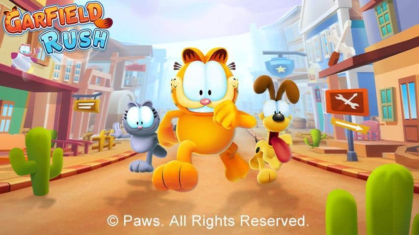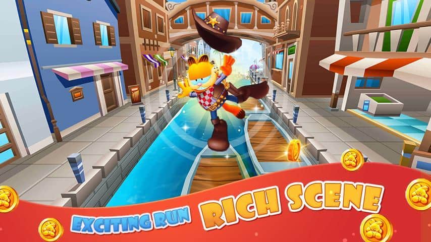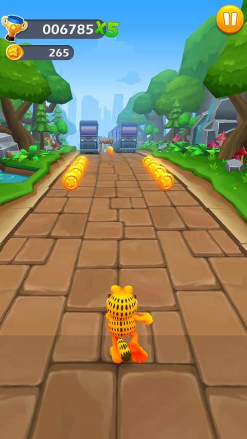 Garfield Rush – gran corredor para Android, donde ayudarás a Garfield a atrapar al astuto Harry. Nuestro héroe decidió disfrutar de una deliciosa lasaña que apareció inesperadamente y Harry le robó su plato. Ve en persecución del delincuente y corre por las estrechas calles de la ciudad. Conduce a alta velocidad y evita los muchos coches estacionados en la acera sin olvidar recoger bonificaciones y monedas. En tu camino encontrarás muchos potenciadores como zapatos elásticos, un jetpack y un imán. Úsalos para avanzar rápidamente a través de los niveles y recoger monedas. También podrás comer deliciosa lasaña, espaguetis, pizza, perritos calientes, burritos y pollo frito.