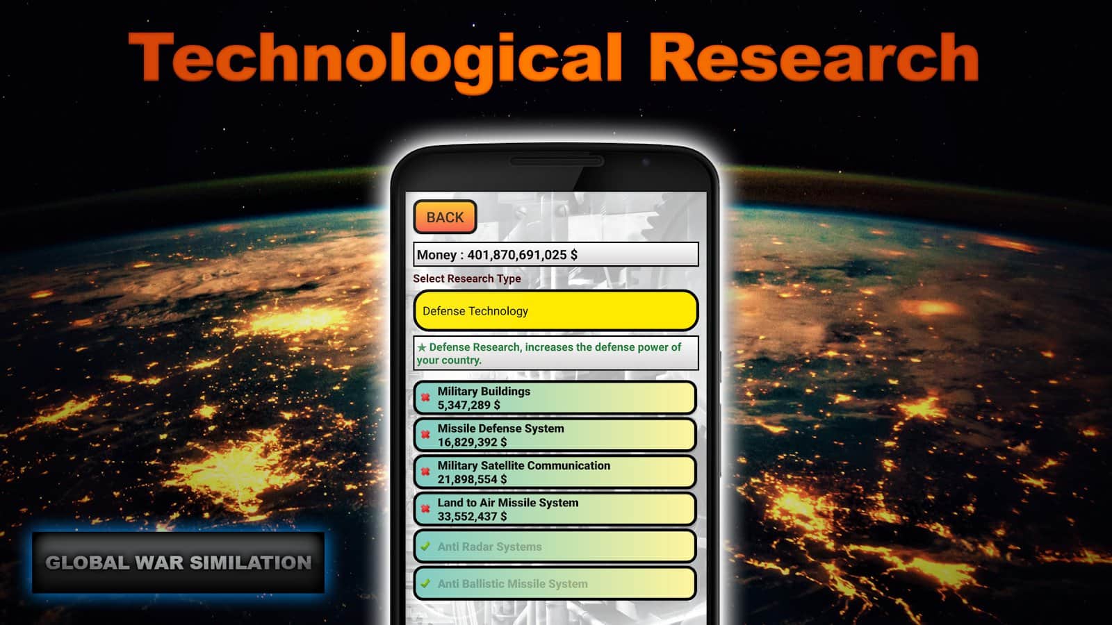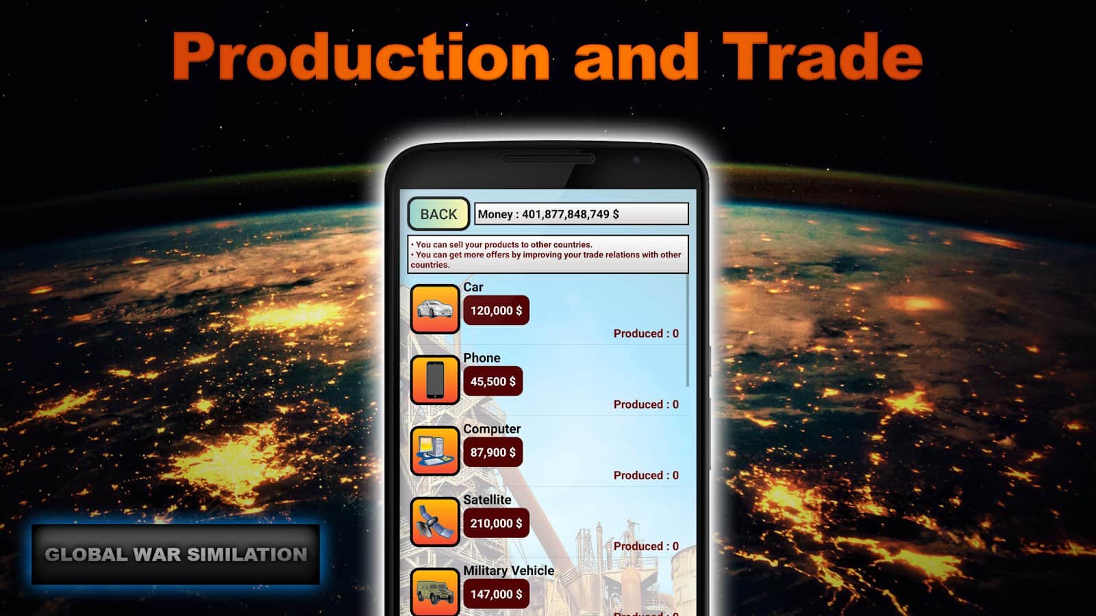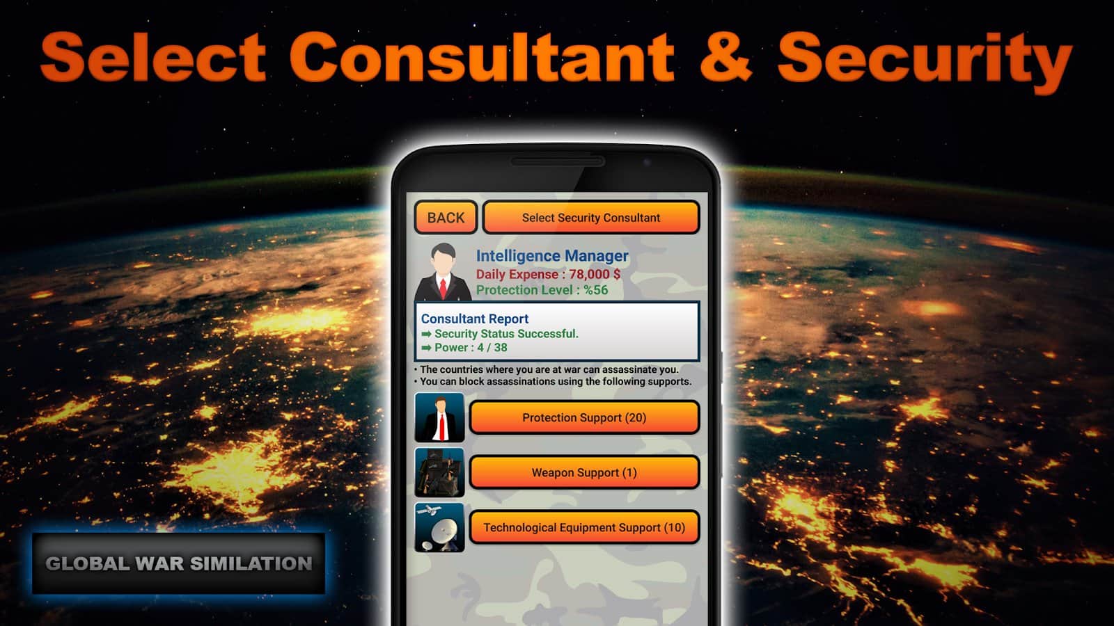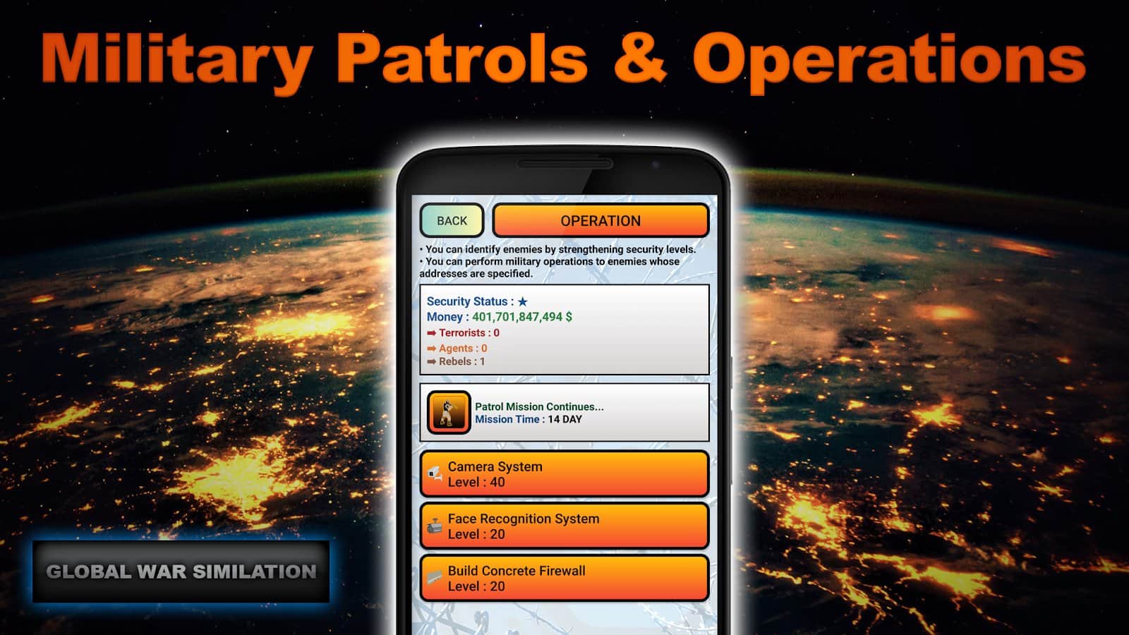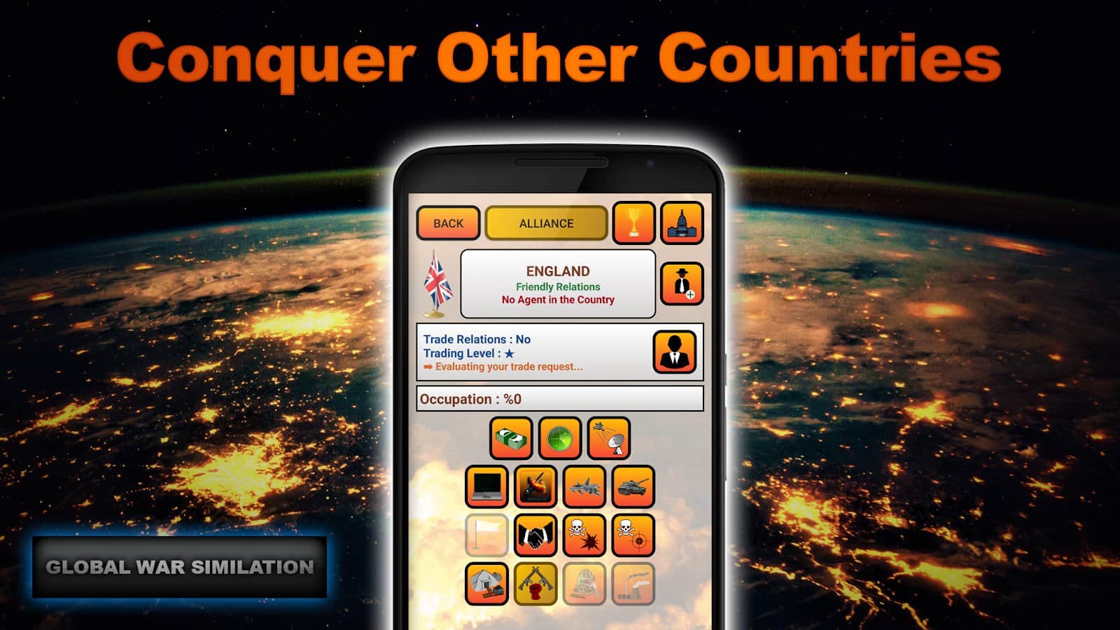 Simulación de Guerra Global - estrategia militar económica en Android, en la que necesitarás gobernar tu país desarrollándolo. Invierte y aprende en diferentes industrias como: espionaje, economía, impuestos, inversiones, investigación y muchas más. Reúne inteligencia militar y económica sobre países y obtén informes militares, económicos, políticos e de inteligencia de todo el mundo. Desarrolla estrategias y gestiona a tu gente. Podrás invadir otros países e incluso conquistar el mundo. Únete a alianzas para desarrollarte junto a otros países y ayudarse mutuamente. La elección es tuya.