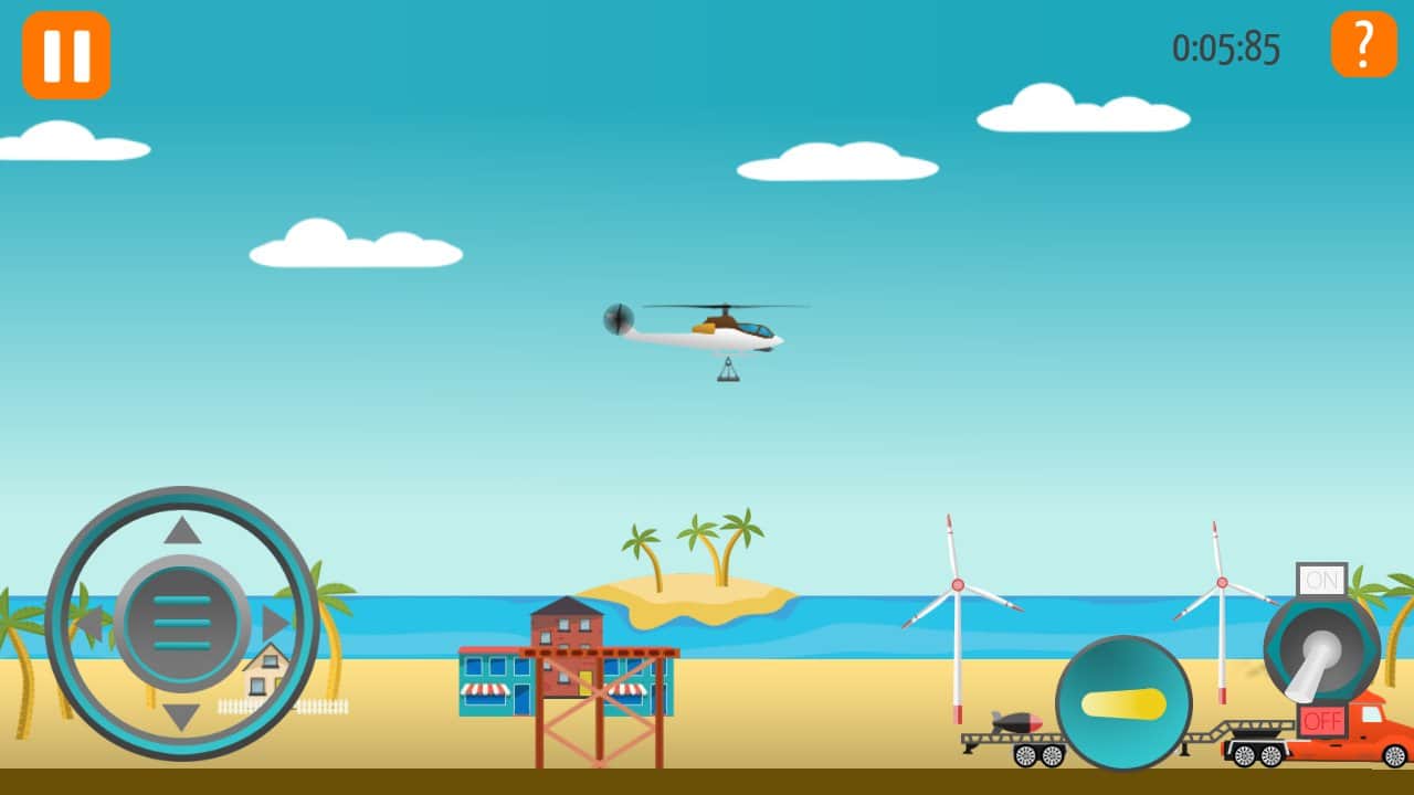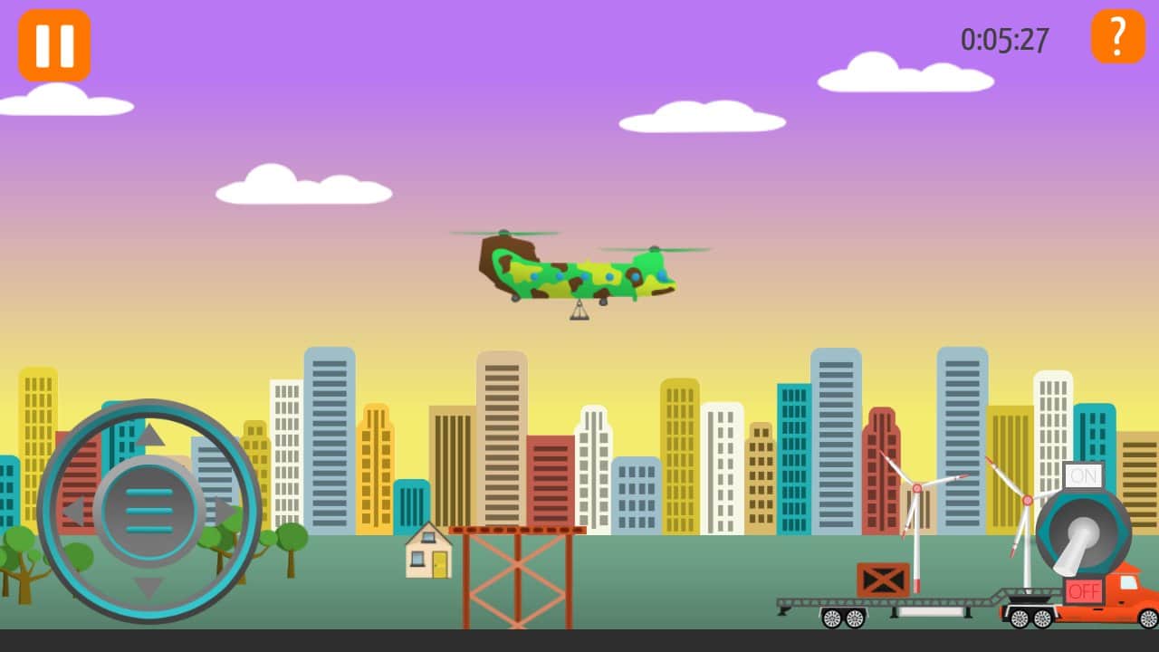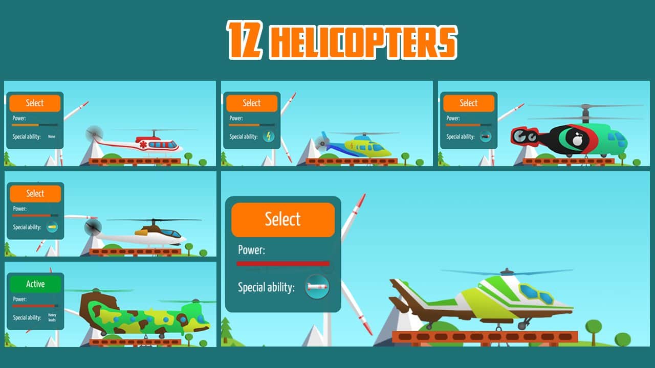 Go Helicopter (Helicópteros) – un juego en Android donde jugarás el papel de un piloto de helicóptero. En este juego, tu tarea principal es volar a baja altura y cumplir todas las misiones y tareas ayudando a coches, barcos y trenes a continuar. En tu camino encontrarás una gran cantidad de problemas diferentes que debes resolver para avanzar. En total, este juego presenta 12 coches diferentes que tienen diferentes propiedades y habilidades. Atraviesa más de 100 niveles de juego y visitarás 8 lugares diferentes como desierto, mar, montañas y la playa. Supera todas las pruebas del juego y resuelve todos los acertijos con puentes, ascensores, elementos explosivos, paredes y cargas pesadas.