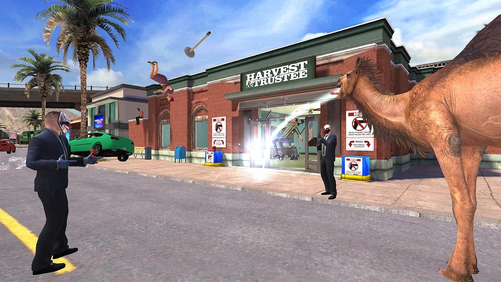 Goat Simulator Payday es un gran juego para Android donde operarás una banda criminal que escapó del zoológico. En este juego tomarás el control del flamenco rosa, un delfín en una camilla, un camello escupidor y una cabra. Tu tarea principal en este juego es escapar del zoológico y robar un banco. Desarrolla su ataque al banco y gasta el dinero robado para comprar nuevas máscaras para los personajes, para evitar ser reconocido por la policía. Cada personaje en el juego tiene sus propias habilidades únicas, por ejemplo: los flamencos pueden volar y controlar la mente de las personas, el delfín puede escalar cualquier superficie usando sillas de ruedas, y un camello escupe agua. Compra máscaras, roba coches caros y escapa de la policía.