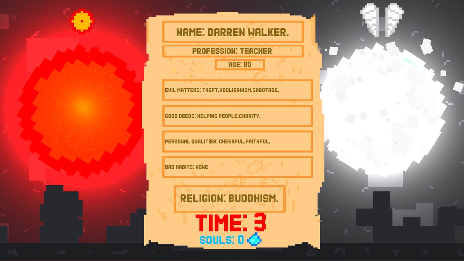 Dios en acción: un juego fascinante en Android, donde serás Dios mientras él está de vacaciones. En este juego actuarás como un reemplazo temporal de Dios y distribuirás las almas de los muertos al infierno o al cielo según sus buenas o malas acciones en vida. Estudia cuidadosamente la historia de cada persona y dirige adecuadamente su alma al lugar especificado. No cometas errores irreversibles, estarás en una posición responsable. El juego cuenta con dos modos de juego: