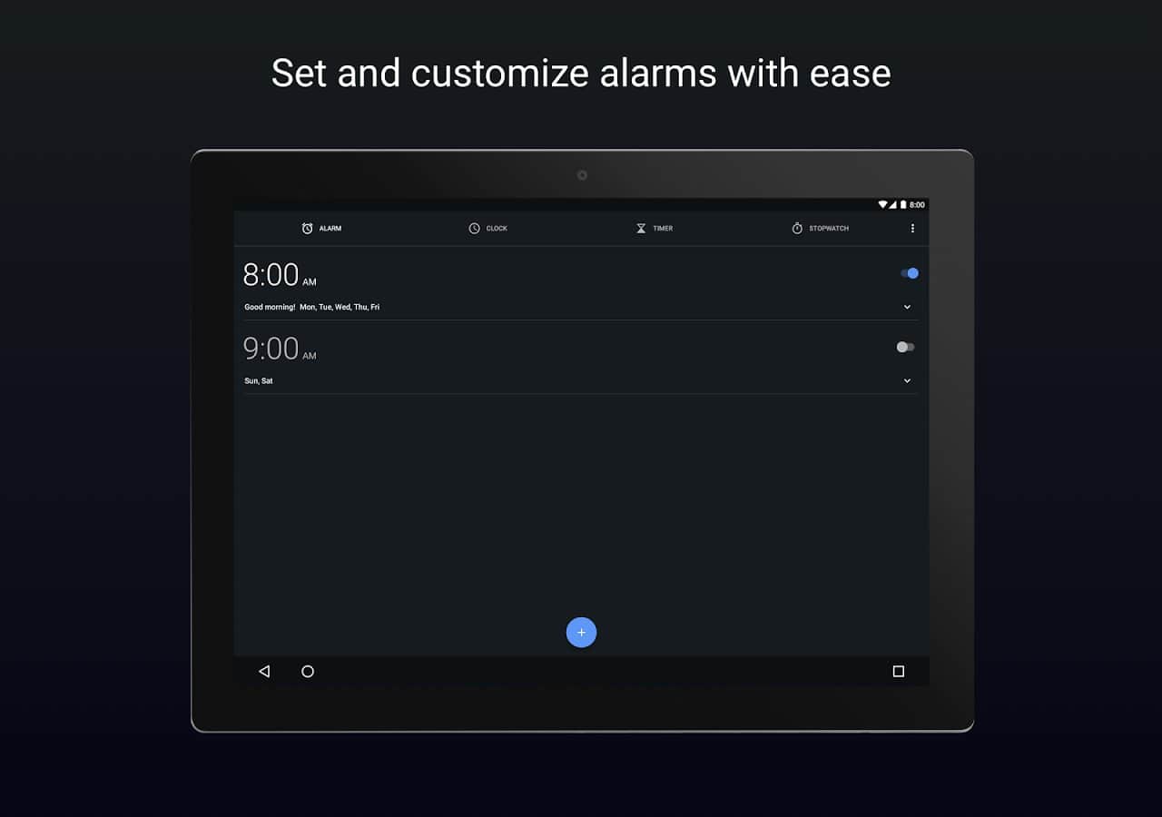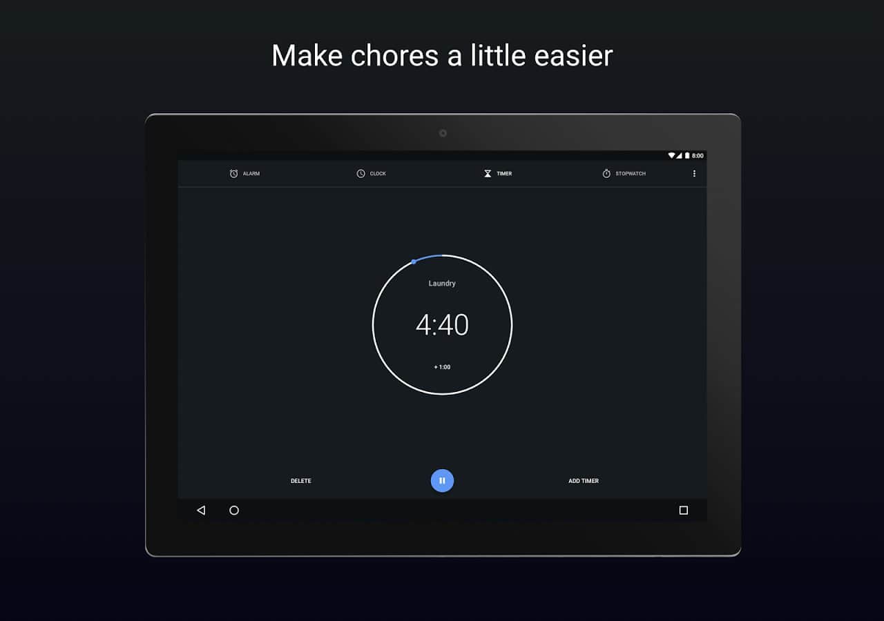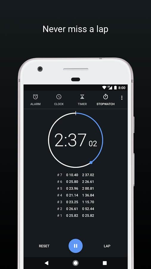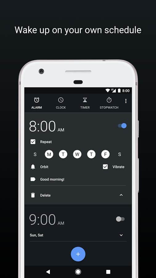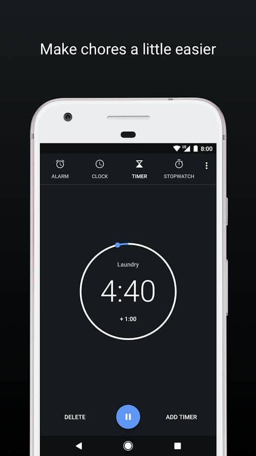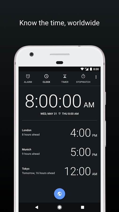 La aplicación está dividida en cuatro pestañas: alarma, reloj, cronómetro y temporizador. Entre otras características, es interesante el aumento progresivo del volumen de la alarma y la posibilidad de agregar ciudades importantes para ti en la pestaña de hora mundial.