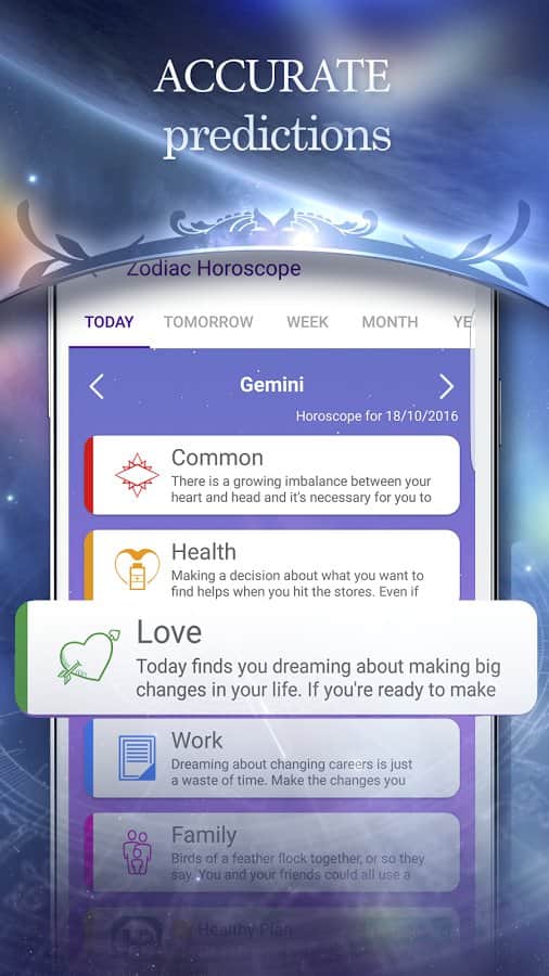 Horóscopo en línea todos los días - esta aplicación te permitirá conocer tu horóscopo para cada día. Horóscopo elaborado por astrólogos profesionales para personas que necesitan información sobre su futuro. Puedes ver el zodíaco tanto para el día actual como para el siguiente e incluso para una semana. La aplicación utiliza información del recurso astromeridian.