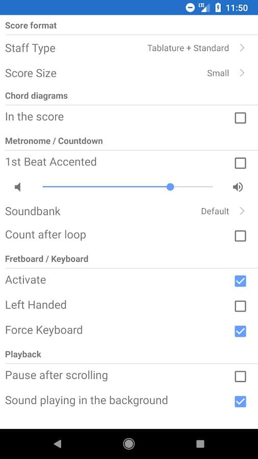 - Diapasón de guitarra o bajo (para diestros y zurdos), y teclado virtual