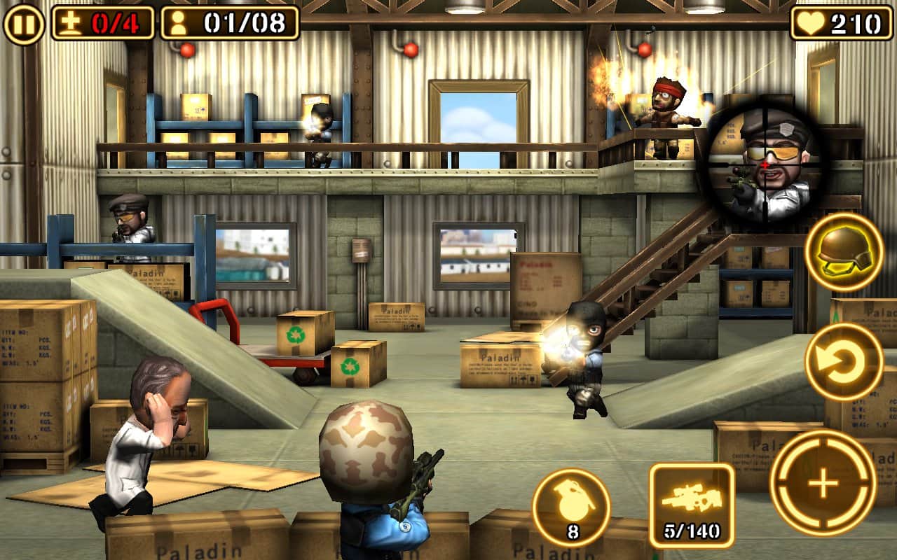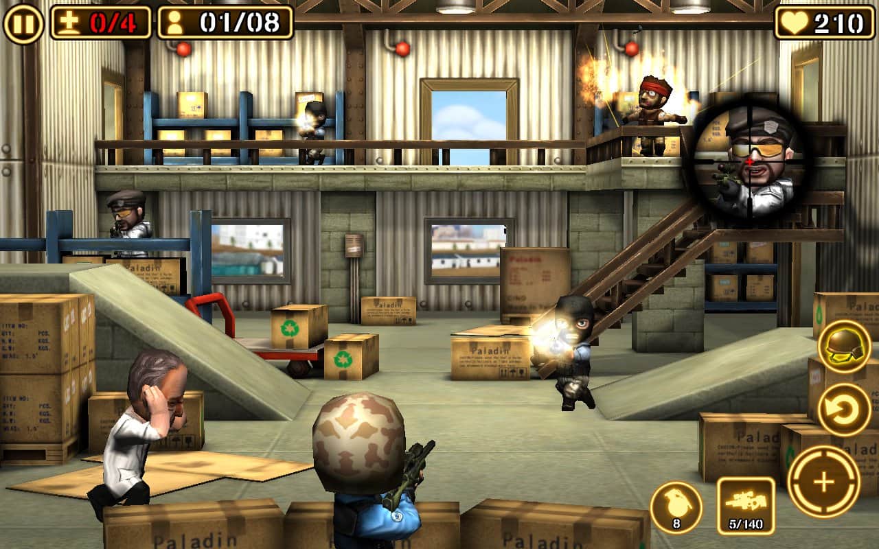 Gun Strike 2 - este juego para Android es un interesante tirador, en el que estaremos matando terroristas de diversas clases. Los ciudadanos comunes pueden verse atrapados en el fuego cruzado, así que asegúrate de disparar con precisión y no golpear a transeúntes inocentes. Te espera una gran variedad de armas, que por cierto se pueden modernizar, aumentando su potencia de fuego. Las granadas también están en uso, y si se utilizan correctamente, se pueden matar a varios terroristas de un solo golpe.
