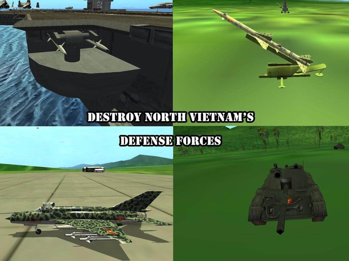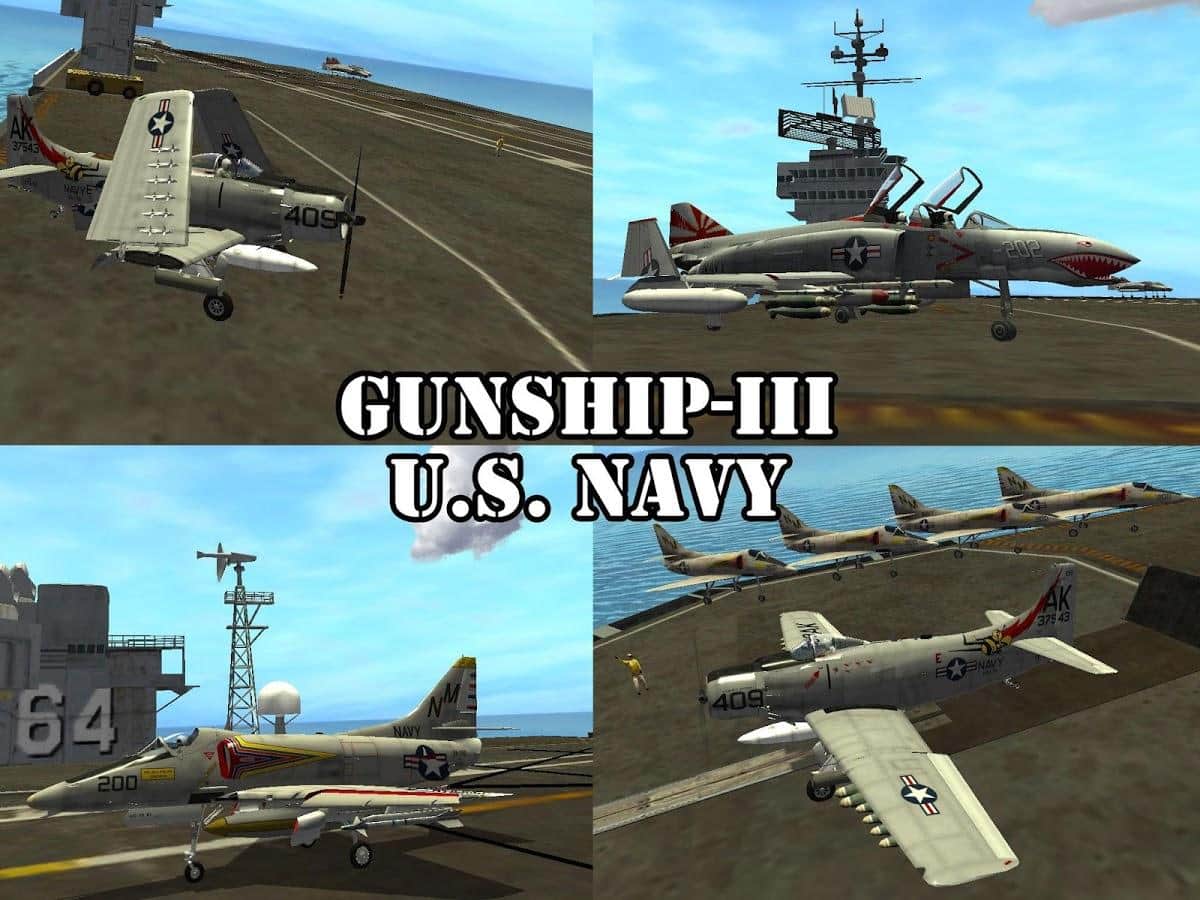 Gunship III - U.S. NAVY - Continuación de la serie de juegos de Gunship en Android. Este juego es una expansión de la tercera parte del juego, cuyas acciones transcurren en Vietnam. Se ha ampliado un poco tu arsenal: se han añadido el A-1 Skyraider volable, el A4E Skyhawk y el F4B Phantom II. Como antes, te espera el despegue y aterrizaje desde la cubierta del portaaviones de la Marina de los EE. UU. El juego se desarrolla en un mundo tridimensional más o menos realista.