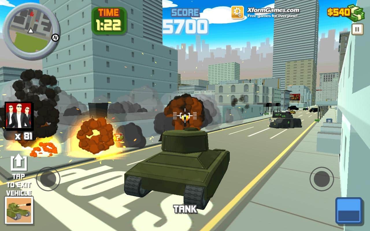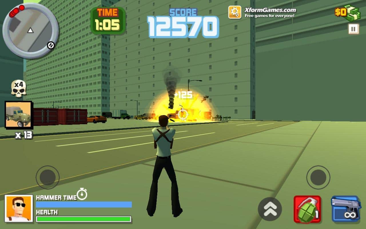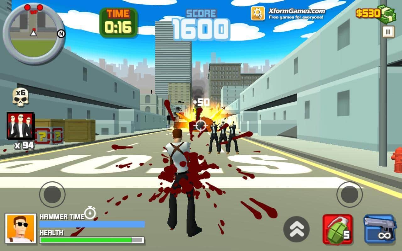 Juego de acción Hammer 2 en Android donde ayudarás al valiente héroe a limpiar las calles de la ciudad de los malhechores. Las calles de tu ciudad están inundadas de enemigos y el único que puede enfrentarse a ellos solo es nuestro héroe Hammer. Realiza más de 30 misiones diferentes y cada una de ellas te dará nuevos enemigos y poderosos jefes. Destruye enemigos con diversas armas, incluyendo el uso de explosivos. A medida que avances en el juego, desbloquearás muchos vehículos, como tanques, helicópteros, coches, motocicletas y otros. Gana numerosos logros y compite con amigos por los mejores resultados. También no olvides visitar las tiendas donde podrás comprar artículos únicos.