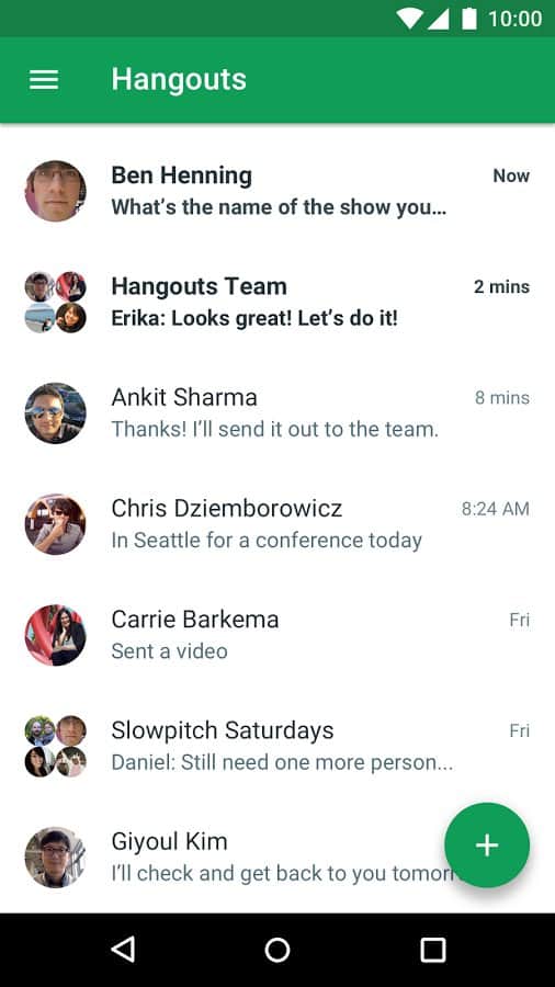 Hangouts, enviar y recibir mensajes de sus amigos. Esta aplicación le ayudará a mantenerse en contacto con ellos. Podrá comunicarse en chat de voz, o enviar mensajes sms, mms, y también organizar reuniones por video. Si desea chatear instantáneamente con muchos amigos, puede crear una conversación grupal, que puede conectar hasta 150 usuarios, lo cual es muy poco.