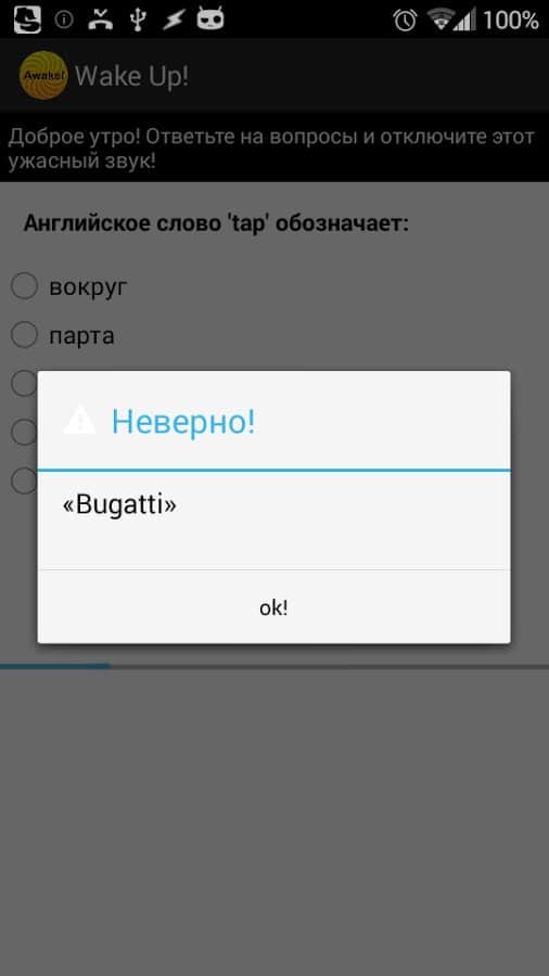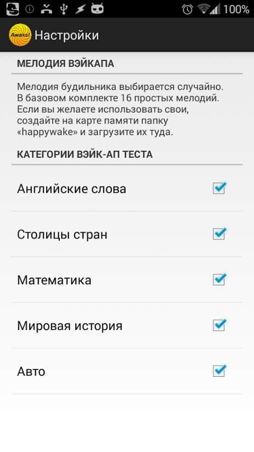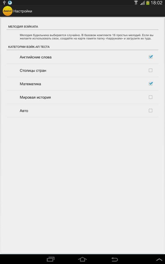 HappyWake – te presentamos un despertador inquieto, para apagarlo tendrás que despertarte completamente y pasar una mini prueba que consiste en las siguientes categorías: palabras en inglés, matemáticas, automóviles, historia mundial, capitales de países del mundo. Cabe destacar que las categorías para la aplicación las defines tú mismo en la configuración del despertador.