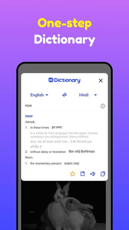 Hi Dictionary es un poderoso traductor a 108 idiomas que puede traducir texto y fotos con un clic. Con él, puedes traducir fácilmente palabras, frases e incluso oraciones completas a cualquier idioma. La aplicación tiene una búsqueda rápida y corrección instantánea, lo que la convierte en una herramienta muy conveniente y útil para comunicarse con amigos extranjeros o trabajar con documentos en otros idiomas. También es compatible con la mayoría de las aplicaciones, lo que te permite usarlo en cualquier lugar donde necesites traducción. En solo unos segundos podrás traducir cualquier palabra u oración a cualquier idioma, lo que hace de Hi Dictionary un asistente indispensable en la enseñanza de idiomas y la comunicación en la comunidad internacional.