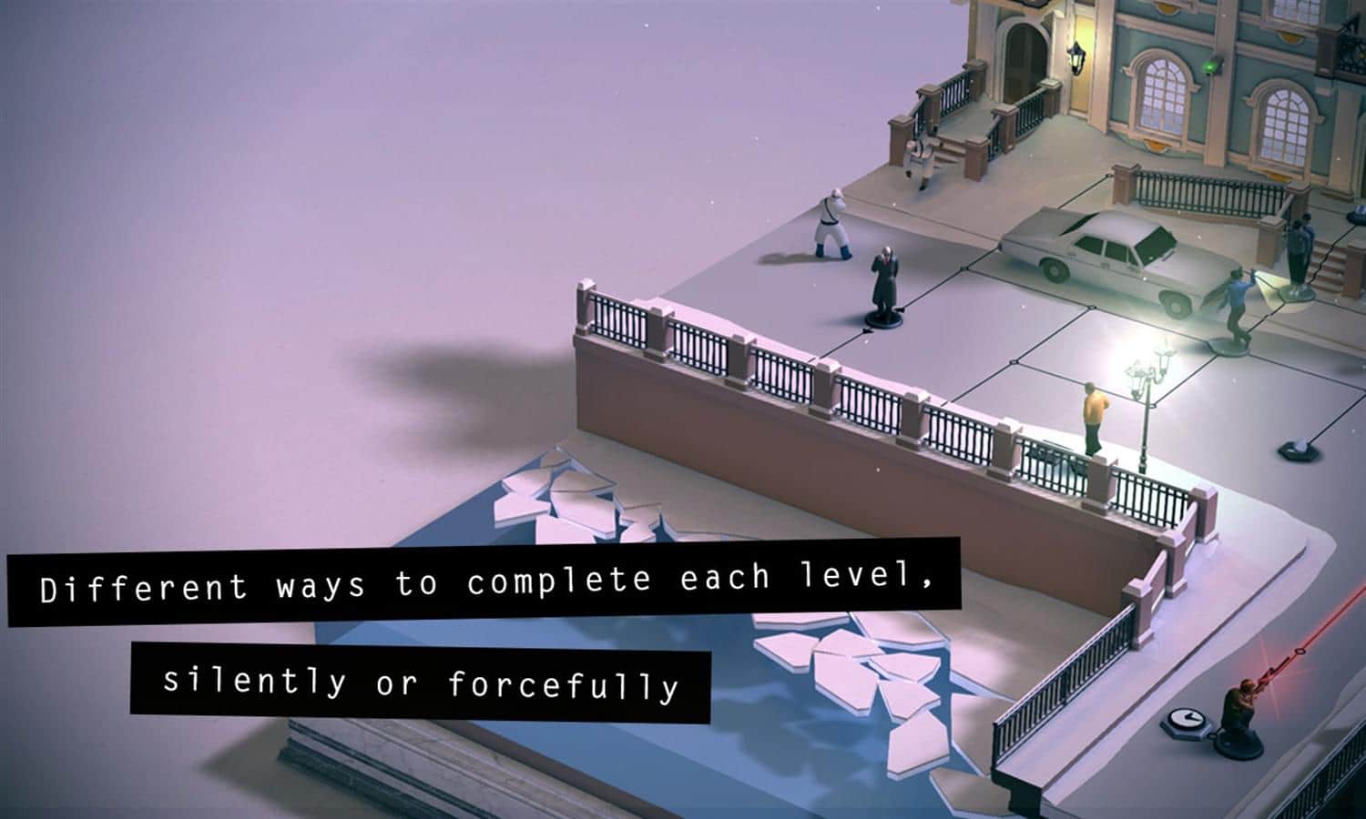 Hitman GO – estrategia paso a paso en la que jugarás como el agente 47 que tenía una misión peligrosa para destruir a los enemigos. Este juego te lleva a un mundo panorámico donde debes moverte en una cuadrícula fija, evitando enemigos y desarrollando tus tácticas para destruirlos. Penetra en los lugares bien protegidos, acercándote cada vez más a la meta utilizando todos los trucos de camuflaje. Este juego requerirá que pongas mucho esfuerzo y paciencia para destruir enemigos mortales usando varias armas, incluyendo la famosa pistola Silverballers. Viaja a través de diferentes mundos y destruye a todos los enemigos que se interpongan en tu camino.