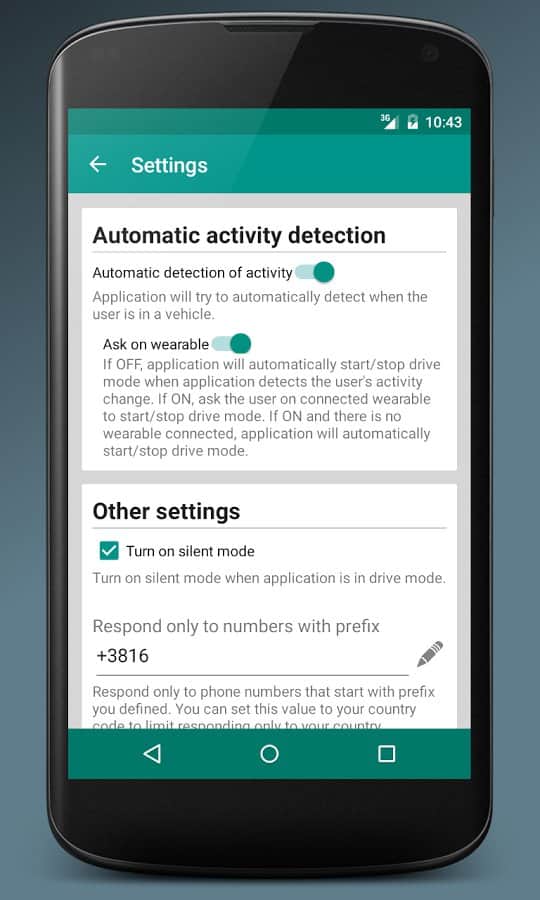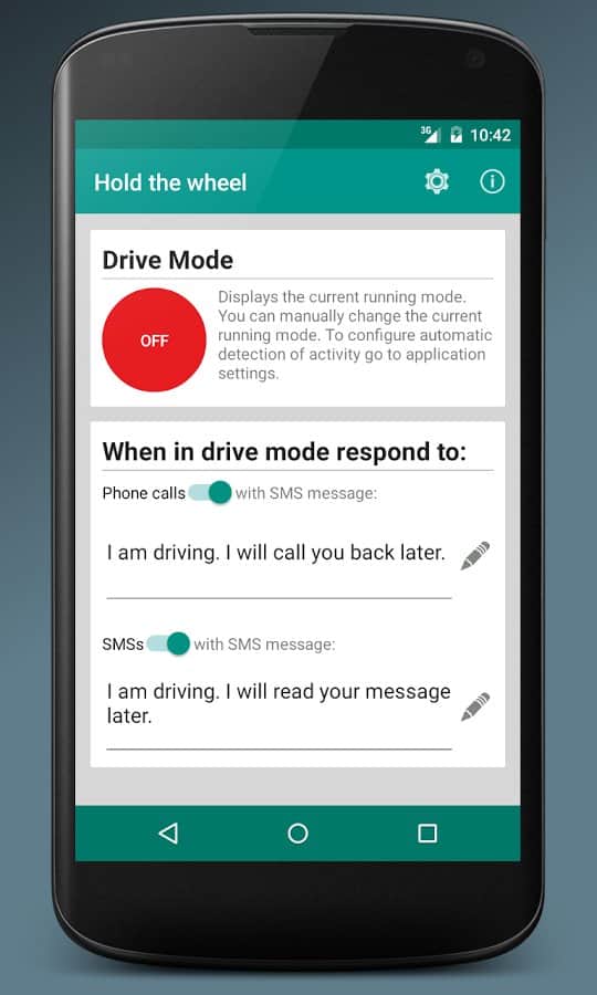 Esta aplicación fue creada para proteger a su usuario durante el uso del automóvil. Así, para todas las llamadas y mensajes entrantes, el programa enviará automáticamente un SMS según una plantilla predefinida, y si es necesario, simplemente activará el modo silencioso. Para evitar inconvenientes como el envío de mensajes costosos, es mejor indicar el código telefónico de su país en el programa. Puede activar Hold the wheel manualmente o dejarlo en automático, que activará el modo correspondiente basado en las condiciones circundantes.