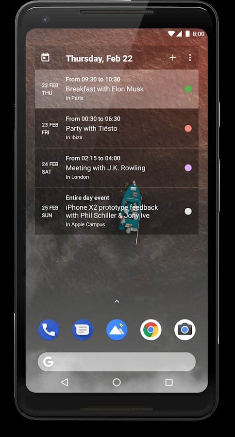 Agenda de Inicio - El Widget de Calendario fue creado para aquellos que valoran su tiempo y a menudo utilizan el calendario para ver fechas específicas, notas de instalación y varios recordatorios. Este hermoso y brillante widget con un diseño impresionante te ayudará a abrir una aplicación en un instante. Siempre estará frente a ti cuando desbloquees la pantalla de tu smartphone y se convertirá en una parte indispensable del escritorio. Una gran ventaja es el hecho de que el ícono de actualización ocurre con la aplicación "Calendario" debido a su sincronización.