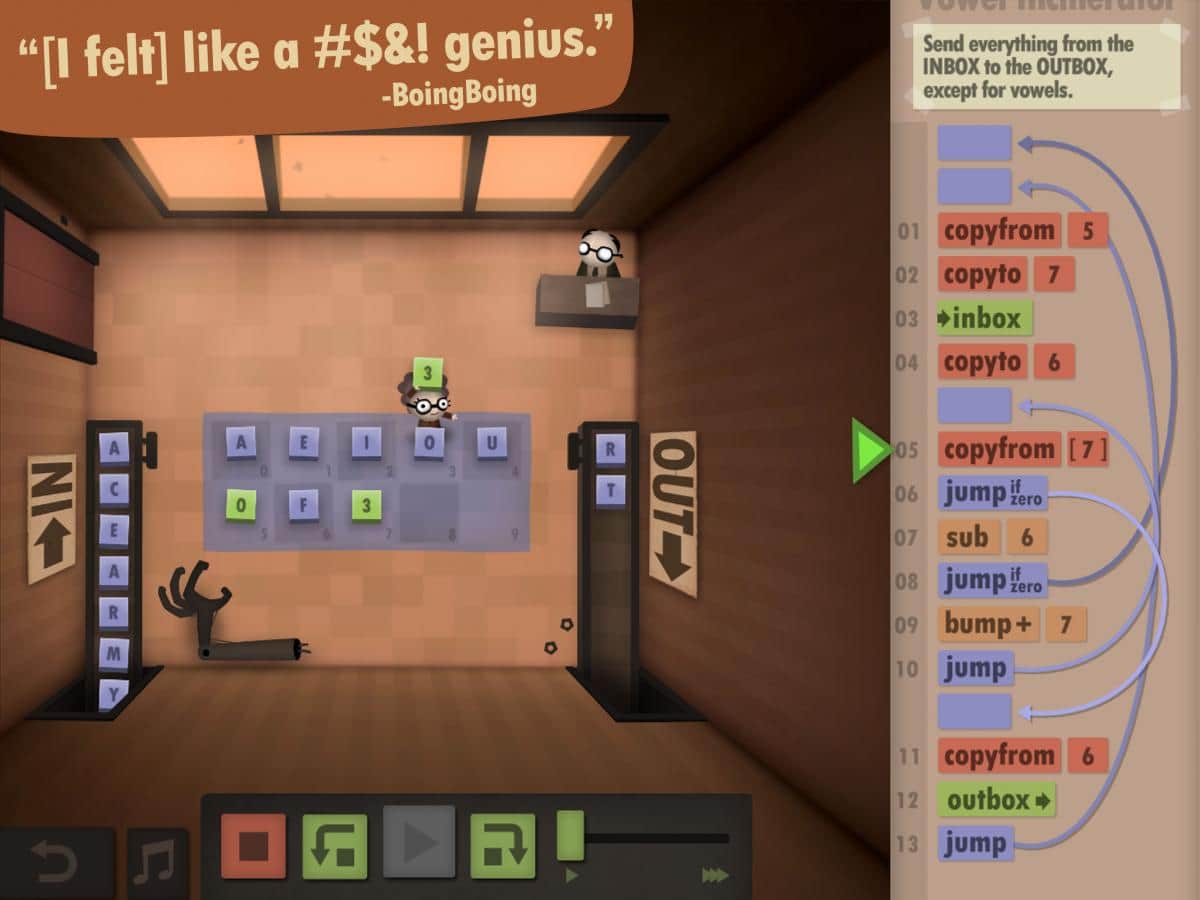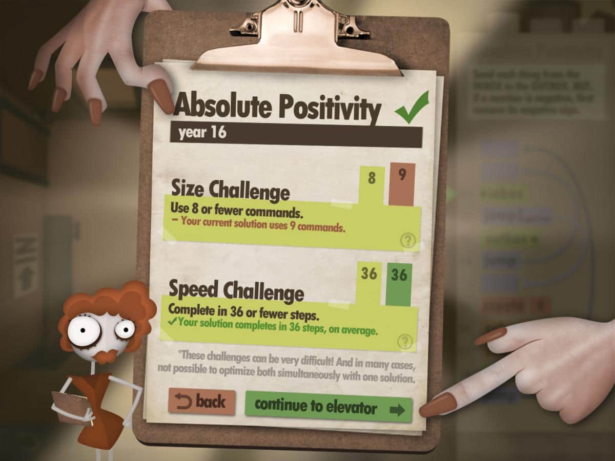 Human Resource Machine es un colorido y brillante juego de rompecabezas con un estilo de narración interesante y una interfaz gráfica de usuario. El estilo de dibujo recuerda a juegos como World of Goo y Little Inferno. En este juego tienes que jugar como un plankton de oficina regular y ejecutar todo lo que le digas. En cada nueva misión necesitas completar tareas. Y esto se hace programando al trabajador de oficina. No tengas miedo, si eliminas todo lo excesivo con un lenguaje de programación, resulta ser un trabajo bastante simple, a veces incluso divertido. Diviértete al máximo y recuerda que la guía siempre te está observando.