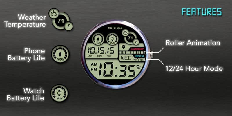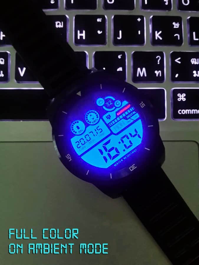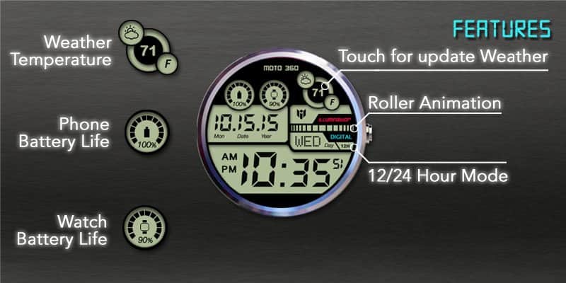 Hay quienes gustan del minimalismo, sin elementos que distraigan, y hay quienes lo encuentran aburrido. Esta esfera está diseñada para aquellos que disfrutan de muchos pequeños detalles en el reloj y un diseño futurista. Aquí, en un diseño brillante y elegante, podrás obtener información sobre la hora actual, la fecha (día, mes, año), el clima, la temperatura, el estado de carga del reloj y el smartphone conectado.