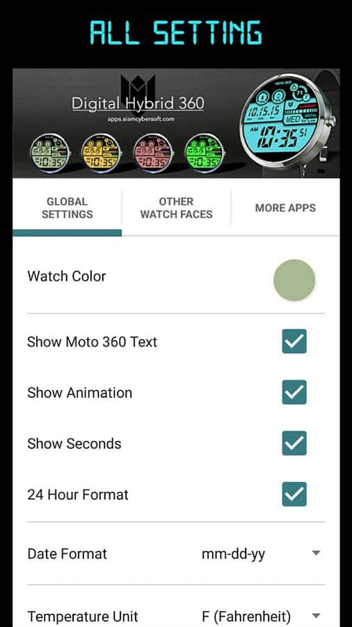 En la configuración puedes elegir el esquema de color, el formato de fecha, la visualización de la temperatura (Fahrenheit/Celsius) y el formato de hora (12 o 24 horas) y agregar la visualización de segundos.
