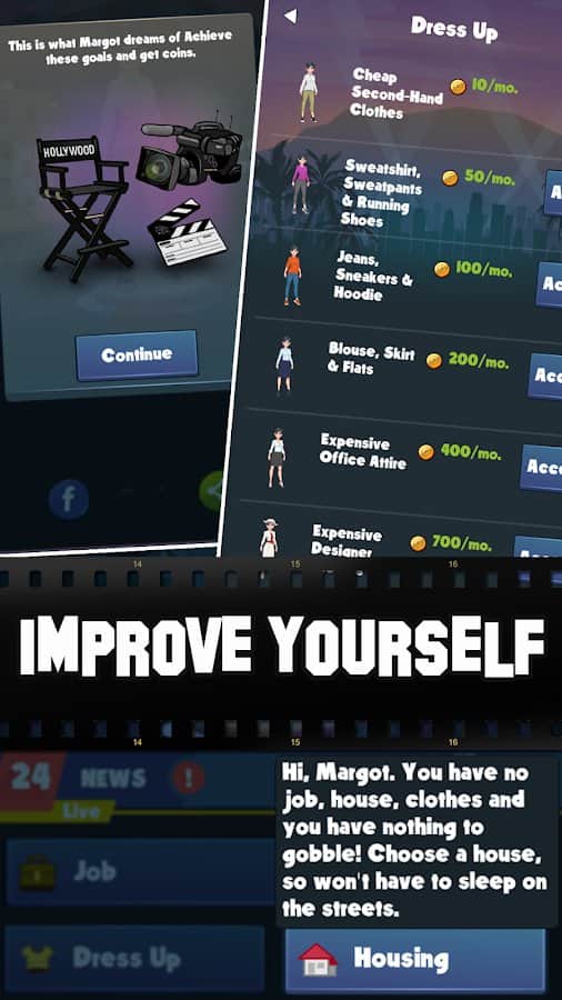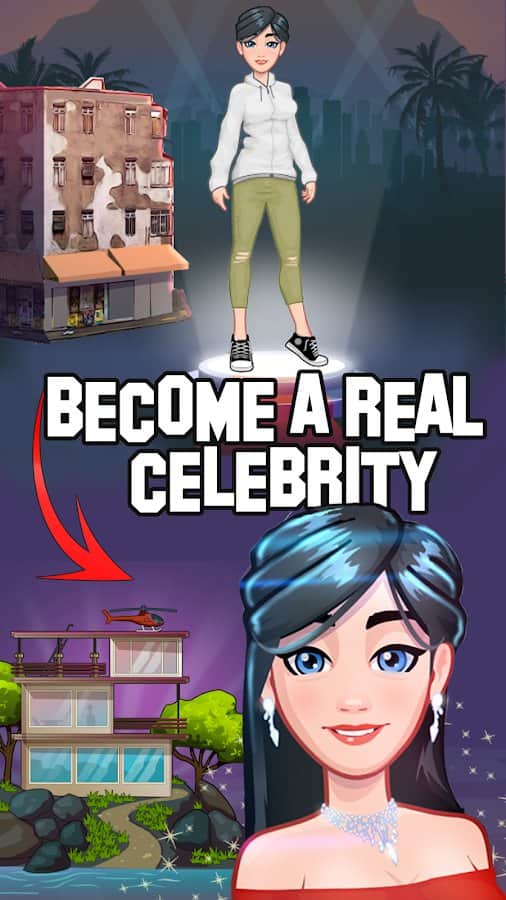 Idle Celebrity - Historia de Hollywood – un juego para Android donde tomarás el camino del estudiante desempleado a superestrella. Toma el control de tu personaje principal y recorre junto a él el difícil camino de la formación de la personalidad. En este juego abrirás todas las puertas, podrás convertirte en actriz, diseñadora de moda o modelo de alta costura. Conquista el virtual Los Ángeles y Hollywood. Comienza tu carrera trabajando como camarera, recepcionista y maquilladora y aspira a algo más grande. Después de formarte como piloto, conductor, o salir a navegar, todo está en tus manos. Comunícate y conócelos, haz citas y conviértete en una celebridad.