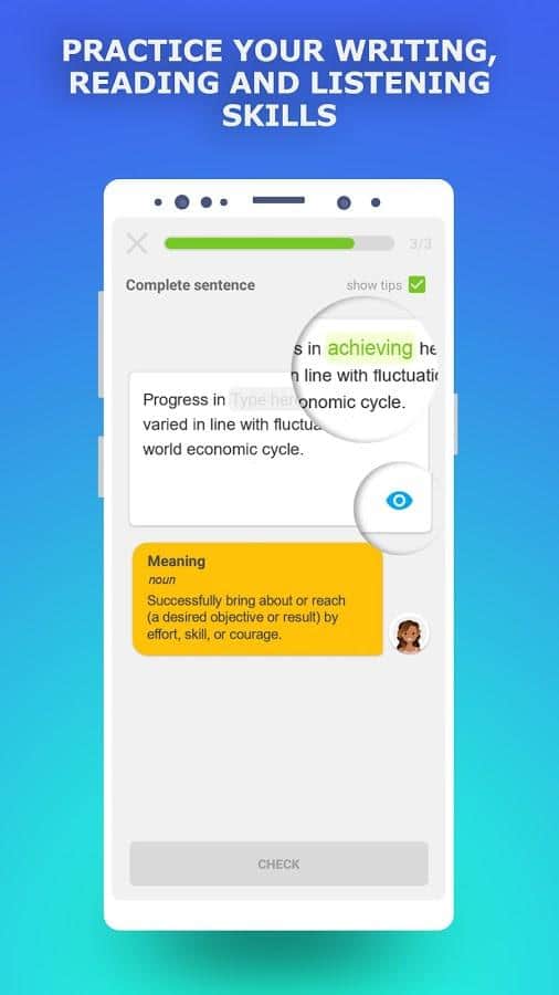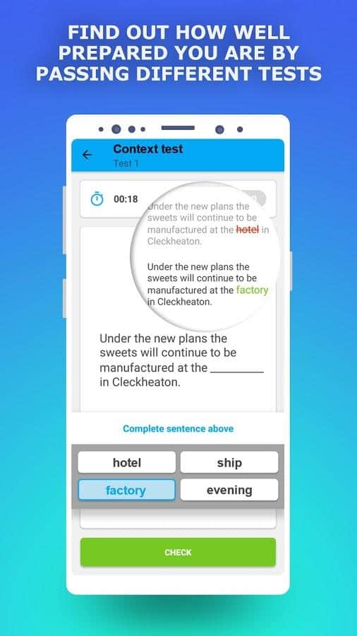 El examen IELTS es una prueba integral lo suficientemente difícil sobre conocimientos de inglés británico. El requisito principal es que debes poseer un amplio vocabulario que pueda abarcar muchos temas especializados, raramente encontrados en la comunicación cotidiana. Esta aplicación te ayudará a aumentar rápida y fácilmente el vocabulario del idioma inglés. La tecnología de estudio de las palabras utilizadas en la aplicación permite aprender rápidamente nuevas palabras en inglés, a menudo utilizadas en los exámenes IELTS. Memorizarás rápidamente la ortografía correcta de las palabras, lo que aumentará significativamente la puntuación final.