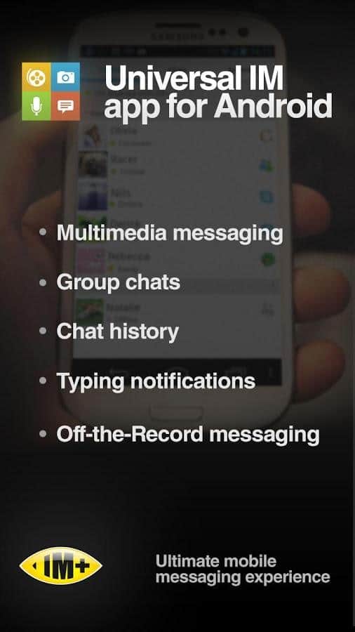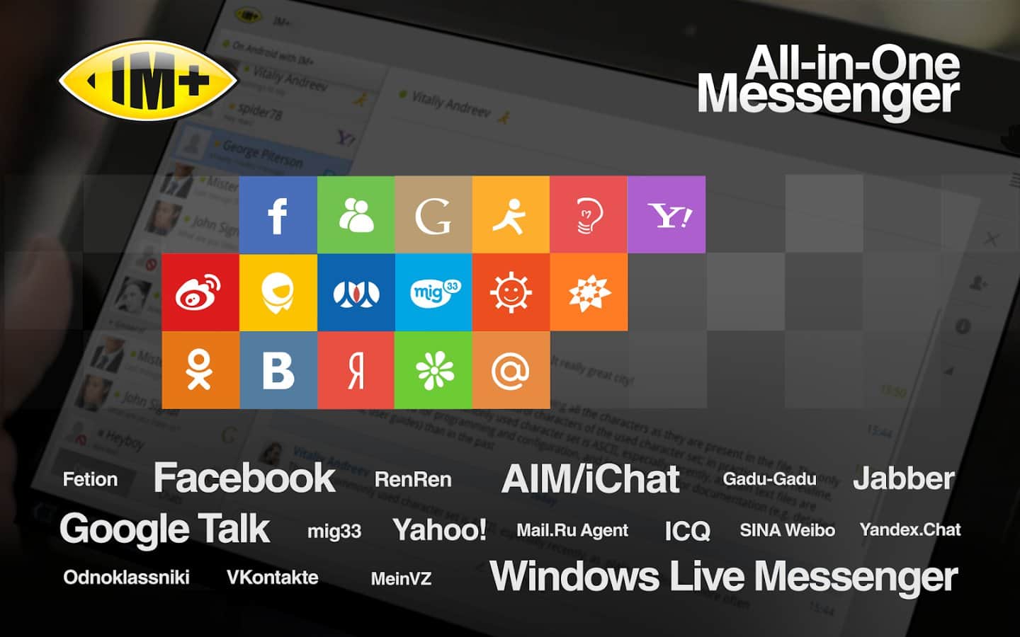 IM+ para Android lo tiene todo, pero ¿esta es la página de Internet que te faltaba? Chatea con tus amigos y colegas a través de Internet directamente desde tu smartphone. Una gran aplicación que es capaz de soportar los siguientes Beep, Skype, ICQ, Vkontakte, Mail.Ru Agent, Compañeros de clase, AOL, Google Talk, Yahoo! MSN, Jabber y otras oportunidades de Internet.