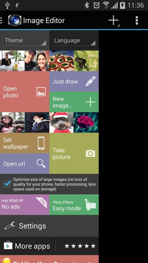 Editor de Imágenes - Esta aplicación es un editor de fotos simple y versátil que incluye todas las funciones principales divididas en categorías y convenientemente organizadas. Además, puedes establecer cualquier foto como fondo de pantalla presionando solo un botón. Las herramientas aquí son en realidad muchas, desde filtros convencionales hasta un montón de pegatinas e imágenes.