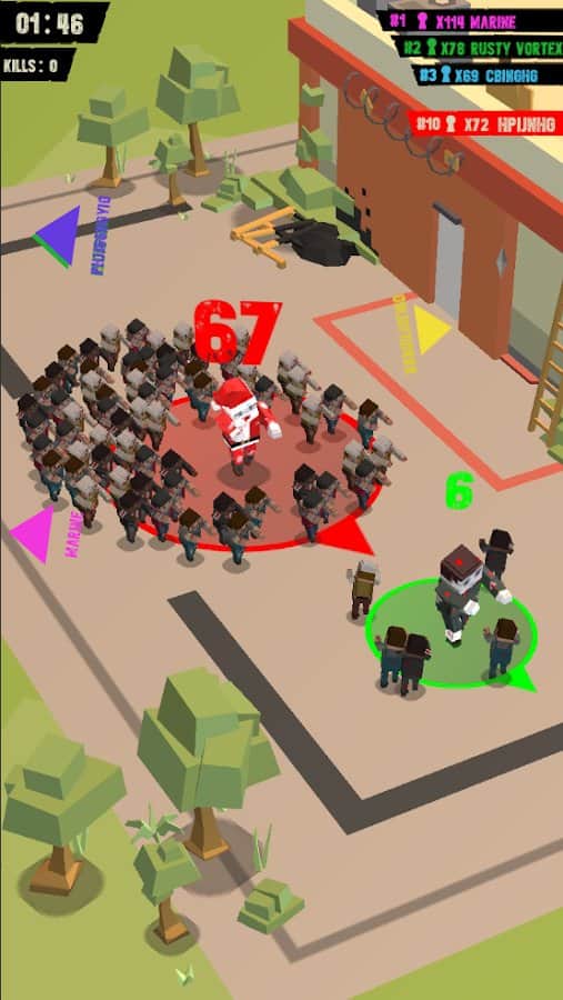 Infect Wars.io – un fascinante juego en Android, donde te conviertes en el rey de los zombis. En este juego jugarás el papel de Santa, quien se moverá por la ciudad e intentará infectar con el virus zombi a tantas personas como sea posible. Explora la enorme ciudad y derriba numerosos obstáculos que se interpongan en tu camino. Reúne a tantas personas como puedas y toma los seguidores de otros participantes, para volverte aún más fuerte y poderoso. Lidera la multitud de zombis y muestra quién es el rey aquí. El juego te complace con entornos dinámicos y destructibles, así como con juegos en tiempo real.