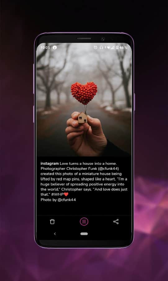 Una aplicación simple y conveniente con la que puedes descargar tus fotos favoritas de Instagram en solo unos pocos clics. Un diseño suave y hermoso, la ausencia de anuncios molestos y la facilidad de uso son la clave del éxito de una aplicación como esta!