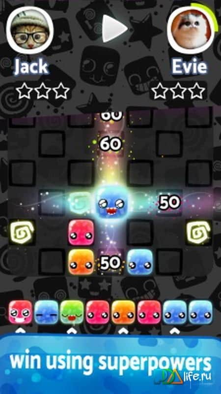 Jelly Duel – juego del género tres en raya en el que puedes jugar con tus amigos y jugadores aleatorios de todo el mundo. En este juego, tu tarea principal será reclutar un número suficiente de más de 300 puntos más rápido que tu oponente. Combina filas de cuadrados divertidos del mismo color que tienen una apariencia única. Explota cadenas de cuadrados y gana puntos y utiliza varios bonificaciones y potenciadores para obtener la cantidad codiciada más rápido que el oponente. Calcula cada movimiento de tu oponente y decide no desafiar acertijos. Los jugadores del juego apreciarán los excelentes gráficos coloridos y la música discreta.