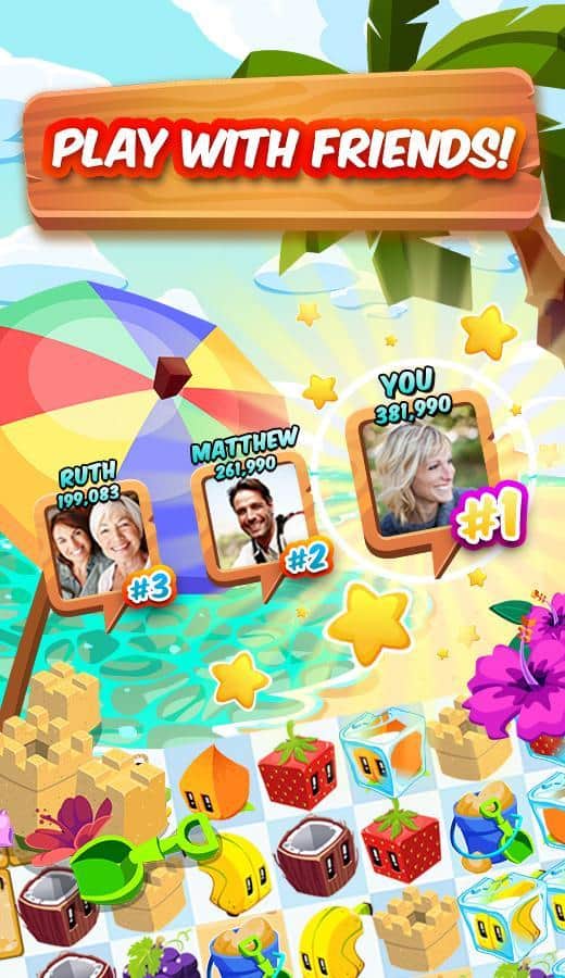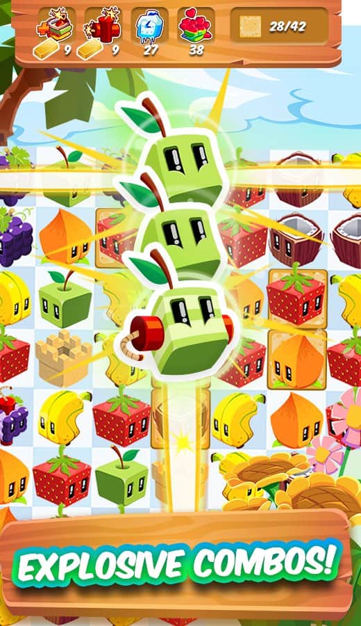 Jugo Cubos - Tres en el patio para Android de los creadores de Angry Birds - Rovio. ¡Encontrarás un juego colorido con frutas divertidas que definitivamente te animarán! Forma cadenas de tres o más escasas y la fruta desaparecerá del campo. Puedes conectar frutas no solo de forma horizontal y vertical, sino también diagonal. Cómo cambiar de dirección en el transcurso de crear una cadena.
