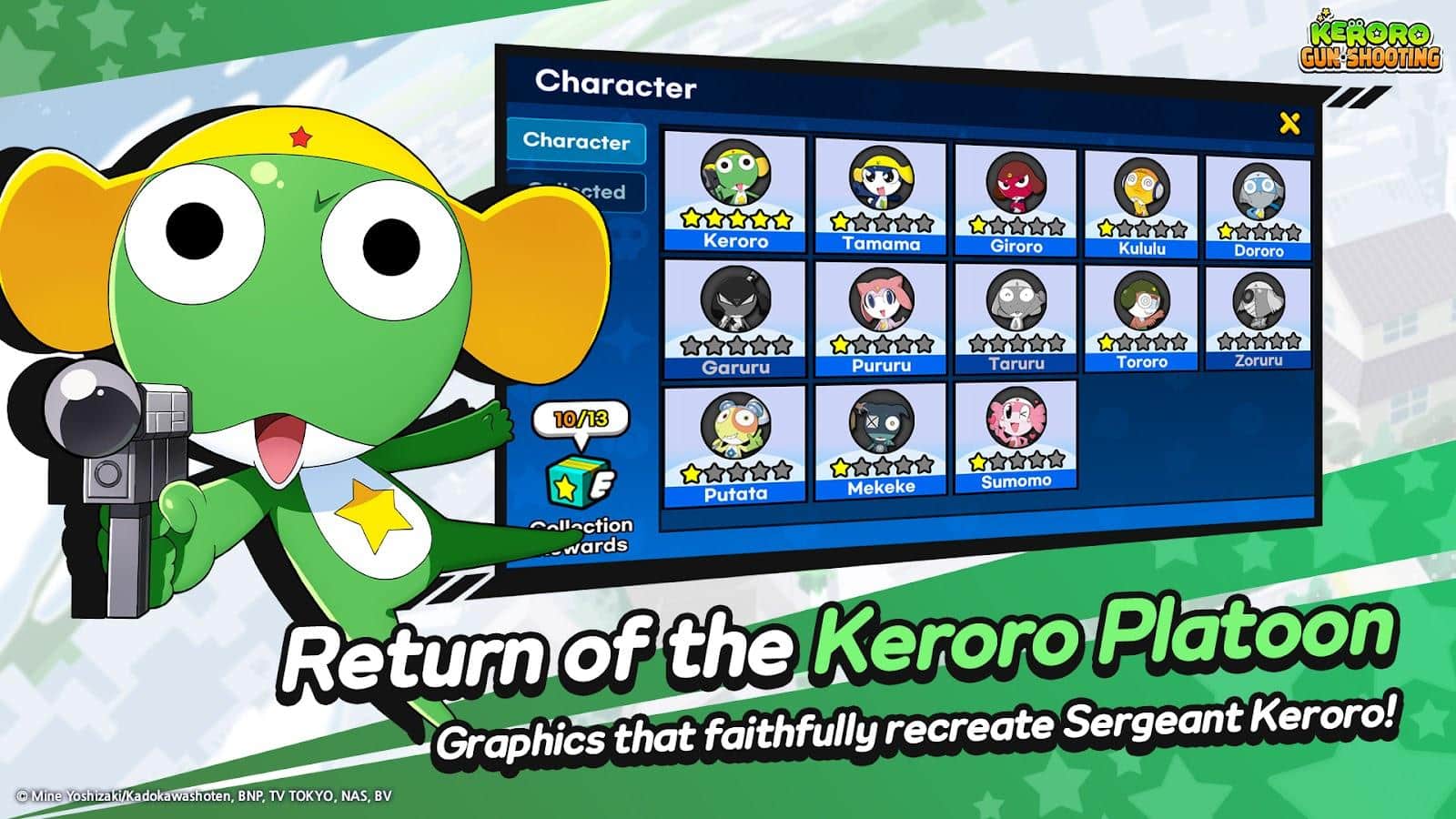 Keroro Gun Shooting - En una misión para conquistar Pekopon, el Sargento Keroro, el comandante de una unidad táctica especial del planeta Keron, y su escuadrón han aterrizado en la Tierra para recopilar información. ¡Únete a estas divertidas y carismáticas ranas en una increíble aventura, ahora disponible en dispositivos móviles!