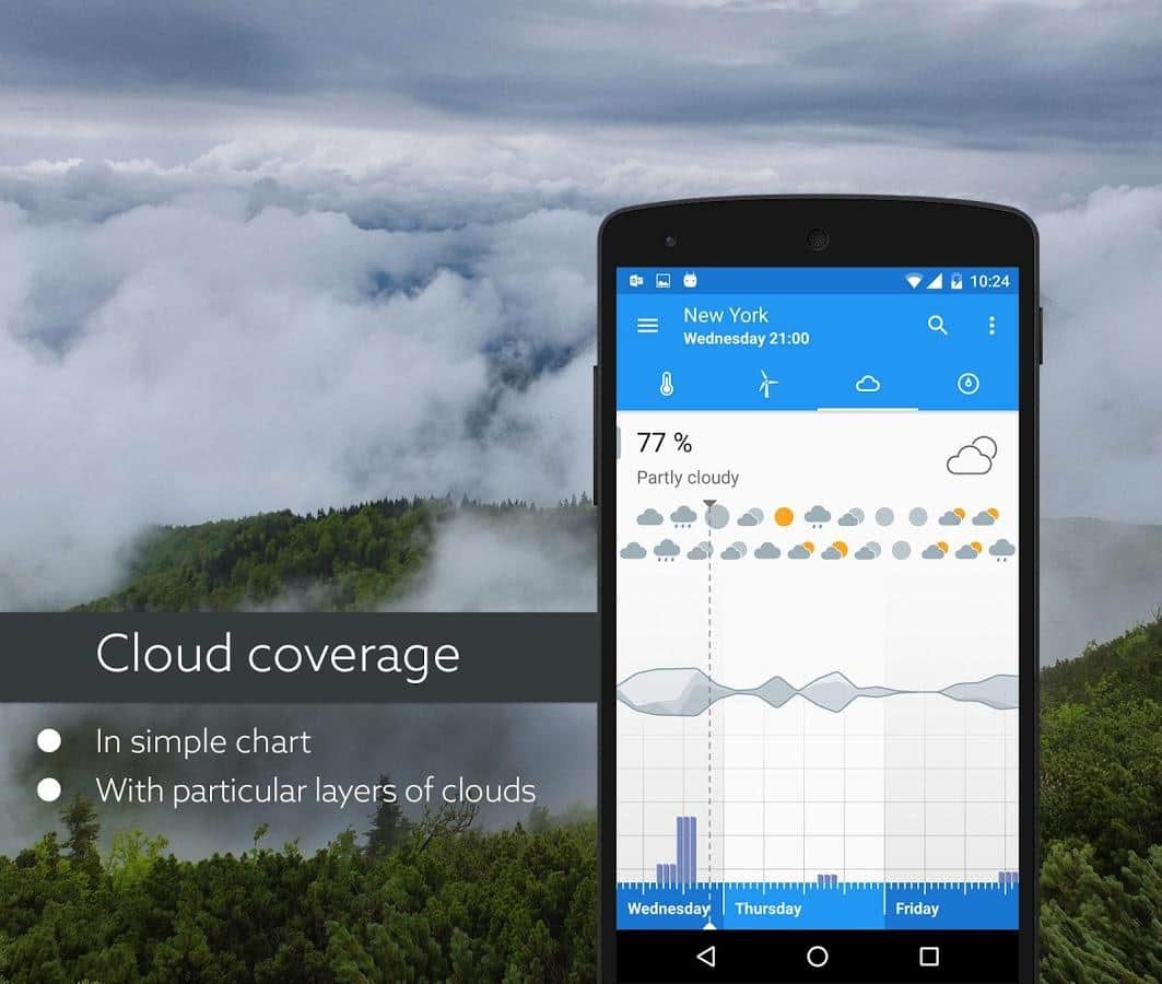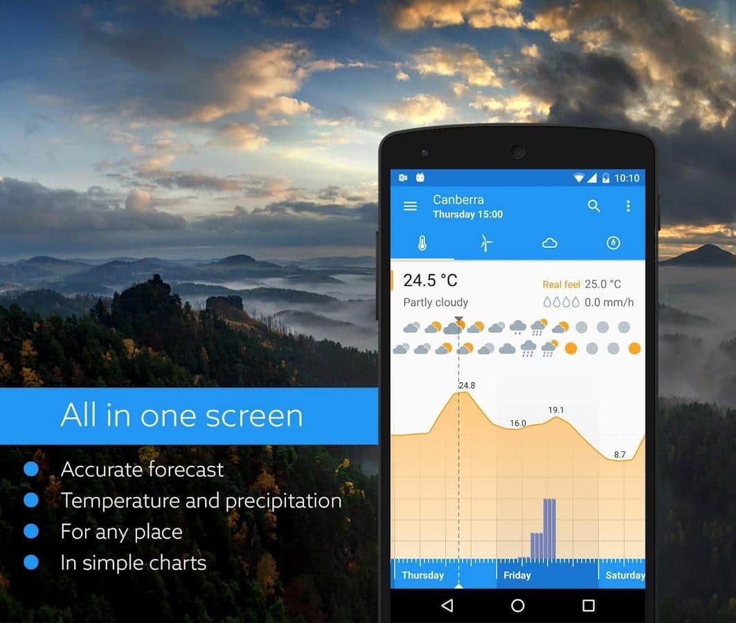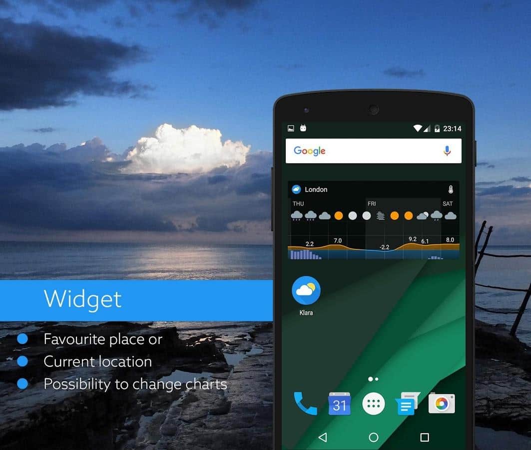Klara es un pronóstico del tiempo muy preciso y cualitativo. La principal diferencia de esta aplicación con otras similares es su control muy inusual. Sí, es la gestión, por extraño que parezca. Tienes que mover manualmente el control deslizante, cambiando así el tiempo y, por lo tanto, el clima en un área de tiempo determinada. La aplicación es muy divertida, colorida y tiene una interfaz fácil de usar. Además, la predicción no solo incluye la temperatura y la presencia de lluvia, sino que también revelará la presencia de nubes y la presión. Mantente siempre informado sobre el pronóstico del tiempo.